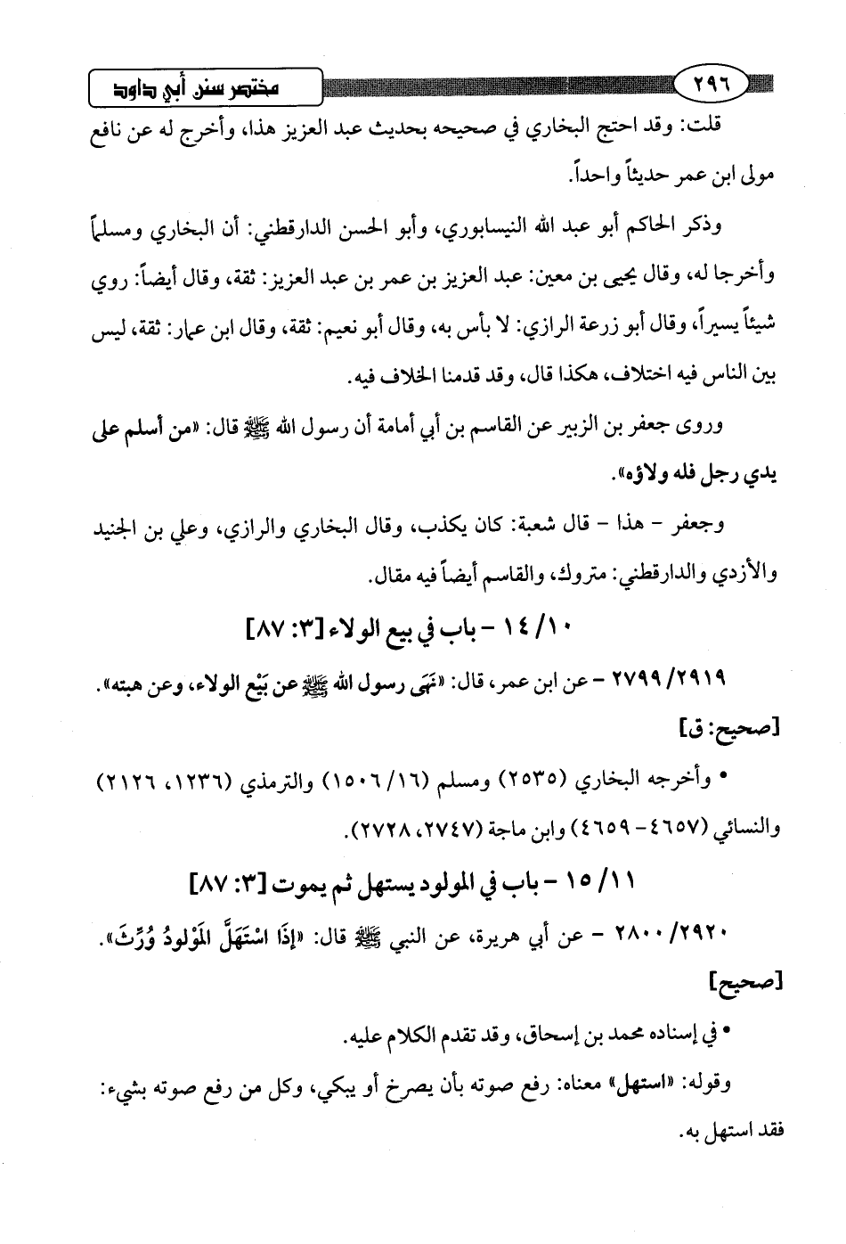 2919/ 2799 - عن ابن عمر، قال: "نَهَى رسول اللَّه -صلى اللَّه عليه وسلم- عن بَيْع الولاء، وعن هبته".hصحيح: ق]