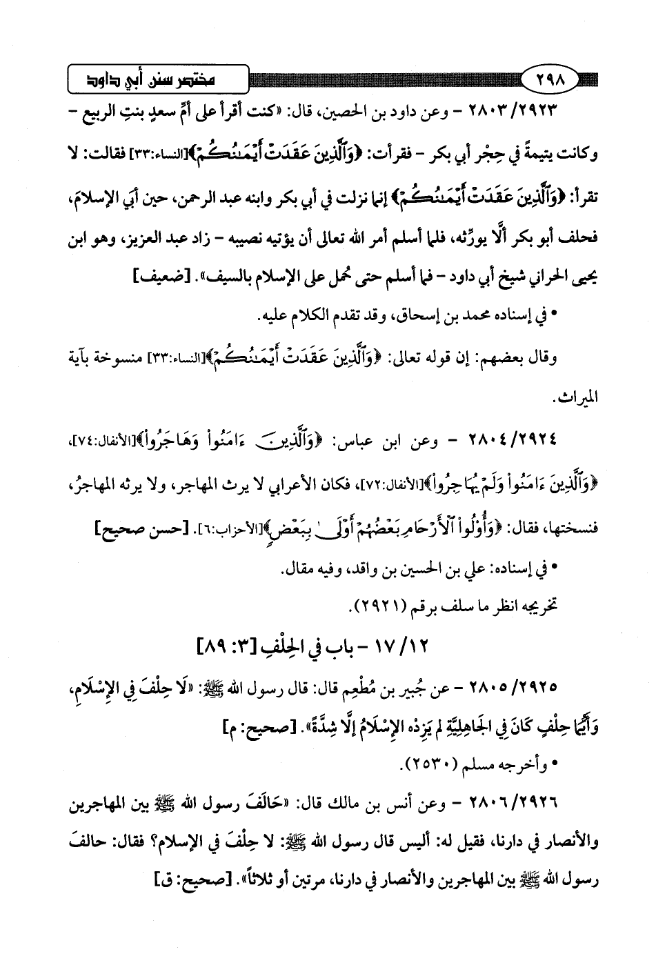 2923/ 2803 - وعن داود بن الحصين، قال: "كنت أقرأ على أمُّ سعدٍ بنتِ الربيع -وكانت يتيمةً في حِجْر أبي بكر- فقرأت: {وَالَّذِينَ عَقَدَتْ أَيْمَانُكُمْ} [النساء: 33] فقالت: لا تقرأ: {وَالَّذِينَ عَقَدَتْ أَيْمَانُكُمْ} إنما نزلت في أبي بكر وابنه عبد الرحمن، حين أبَي الإسلامَ، فحلف أبو بكر ألَّا يورِّثه، فلما أسلم أمر اللَّه تعالى أن يؤتيه نصيبه -زاد عبد العزيز، وهو ابن يحيى الحراني شيخ أبي داود- فما أسلم حتى حُمل على الإسلام بالسيف".hضعيف]