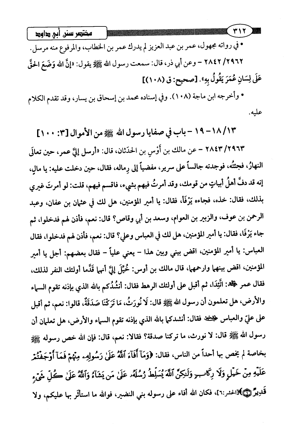 2963/ 2843 - عن مالك بن أَوْسِ بن الحدَثان، قال: "أرسل إليَّ عمر، حين تعالَى النهارُ، فجئتُه، فوجدته جالسًا على سرير، مفضيًا إلى رِماله، فقال، حين دخلت عليه: يا مالٍ، إنه قد دفَّ أهلُ أبياتٍ من قومك، وقد أمرتُ فيهم بشيء، فاقسم فيهم، قلت: لو أمرتَ غيري بذلك، فقال: خذه، فجاءه يَرْفَأ، فقال: يا أمير المؤمنين، هل لك في عثمان بن عفان، وعبد الرحمن بن عوف، والزبير بن العوام، وسعد بن أبي وقاص؟ قال: نعم، فأذن لهم فدخلوا، ثم جاء يَرْفَا، فقال: يا أمير المؤمنين، هل لك في العباس وعلي؟ قال: نعم، فأذن لهم فدخلوا، فقال العباس: يا أمير المؤمنين، اقض بيني وبين هذا -يعني عليًا- فقال بعضهم: أجل يا أمير المؤمنين، اقض بينهما وارحمهما، قال مالك بن أوس: خُيِّلَ إليَّ أنهما قَدَّما أولئك النفر لذلك، فقال عمر -رضي اللَّه عنه-: اتَّئِدَا، ثم أقبل على أولئك الرهط فقال: أنشُدُكم باللَّه الذي بإذنه تقوم السماء والأرض، هل تعلمون أن رسول اللَّه -صلى اللَّه عليه وسلم- قال: لَا نُورَثُ، مَا ترَكنَا صَدَقَةٌ، قالوا: نعم، ثم أقبل على عليّ والعباس -رضي اللَّه عنهما- فقال: أنشدكما باللَّه الذي بإذنه تقوم السماء والأرض، هل تعلمان أن رسول اللَّه -صلى اللَّه عليه وسلم- قال: لا نورث، ما تركنا صدقة؟ فقالا: نعم، قال: فإن اللَّه خص رسوله -صلى اللَّه عليه وسلم- بخاصة لم يخص بها أحدًا من الناس، فقال: {وَمَا أَفَاءَ اللَّهُ عَلَى رَسُولِهِ مِنْهُمْ فَمَا أَوْجَفْتُمْ عَلَيْهِ مِنْ خَيْلٍ وَلَا رِكَابٍ وَلَكِنَّ اللَّهَ يُسَلِّطُ رُسُلَهُ عَلَى مَنْ يَشَاءُ وَاللَّهُ عَلَى كُلِّ شَيْءٍ قَدِيرٌ} [الحشر: 6]، فكان اللَّه أفاء على رسوله بني النضير، فواللَّه ما استأثَر بها عليكم، ولا