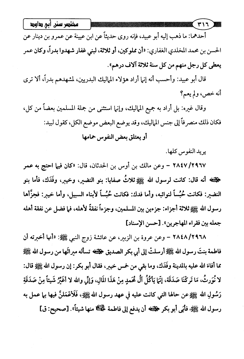 2968/ 2848 - وعن عروة بن الزبير، عن عائشة زوج النبي -صلى اللَّه عليه وسلم-: "أنها أخبرته أن فاطمة بنتَ رسول اللَّه -صلى اللَّه عليه وسلم- أرسلتْ إلى أبي بكر الصديق -رضي اللَّه عنه- تسأله ميراثَها من رسول اللَّه -صلى اللَّه عليه وسلم- مما أفاءَ اللَّه عليه بالمدينة وفَدَك، وما بقي من خمس خيبر، فقال أبو بكر: إن رسول اللَّه -صلى اللَّه عليه وسلم- قال: لا نُوَرثُ، مَا تَركنَا صَدَقَة، إنِّما يأكُلُ آلُ مُحَمدٍ مِنْ هَذَا المَالِ، وإنِّي واللَّه لا أغيِّرُ شَيئًا مِنْ صَدَقَةِ رَسُولِ اللَّه -صلى اللَّه عليه وسلم- عن حالها التي كانت عليه في عهد رسول اللَّه -صلى اللَّه عليه وسلم-، فَلَأعْمَلن فيها بما عمل به رسول اللَّه -صلى اللَّه عليه وسلم- فأبى أبو بكر -رضي اللَّه عنه- أن يدفع إلى فاطمة -رضي اللَّه عنها- منها شيئًا".hصحيح: ق]
