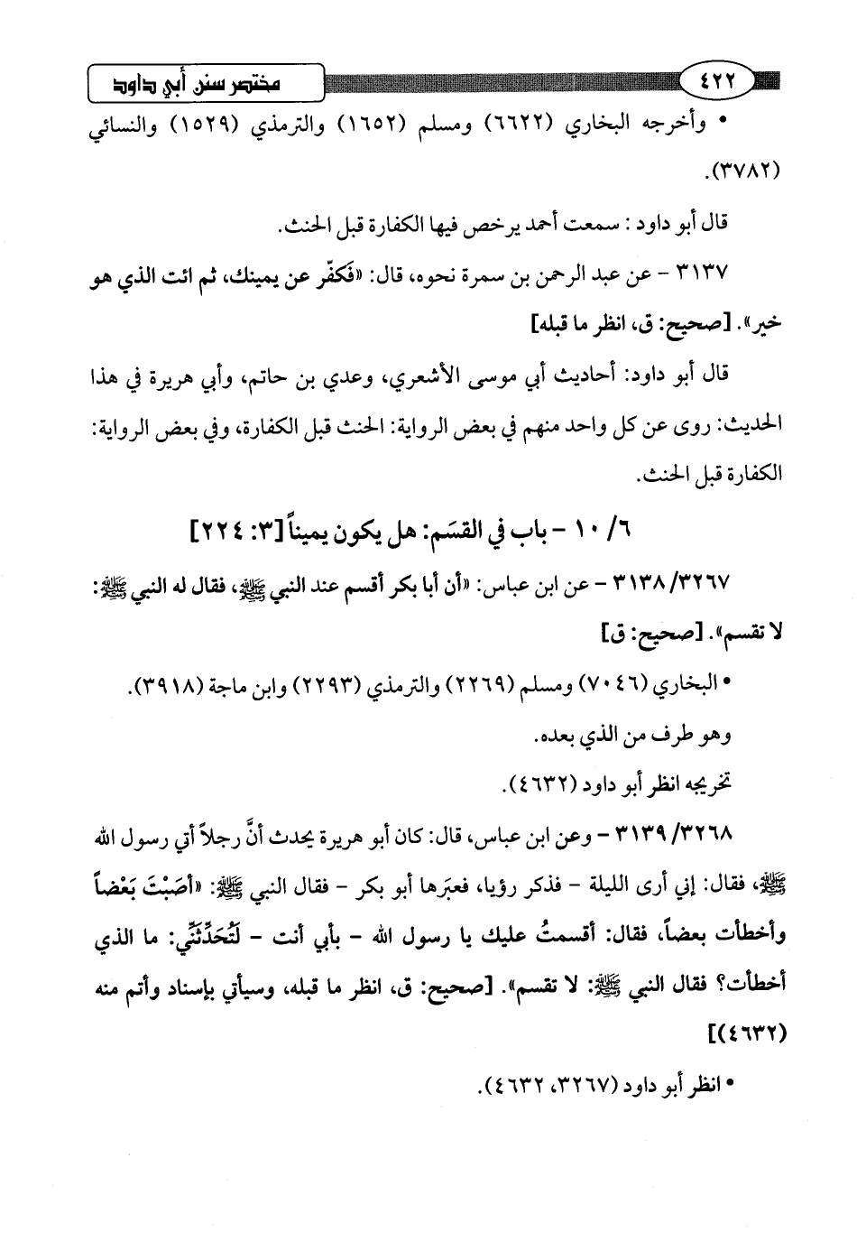 3267/ 3138 - عن ابن عباس: "أن أبا بكر أقسم عند النبي -صلى اللَّه عليه وسلم-، فقال له النبي -صلى اللَّه عليه وسلم-: لا تقسم".hصحيح: ق]