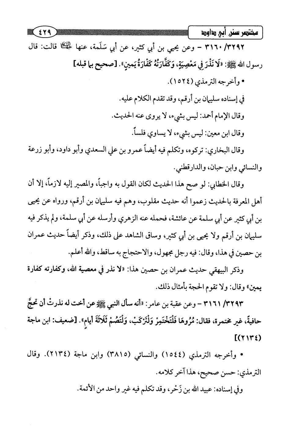 3292/ 3160 - وعن يحيى بن أبي كثير، عن أبي سَلَمة، عنها عليها السلام قالت: قال رسول اللَّه -صلى اللَّه عليه وسلم-: "لَا نَذْرَ فِي مَعْصِيَة، وَكَفَّارَتُهُ كَفْارَةُ يَمينٍ".hصحيح بما قبله]