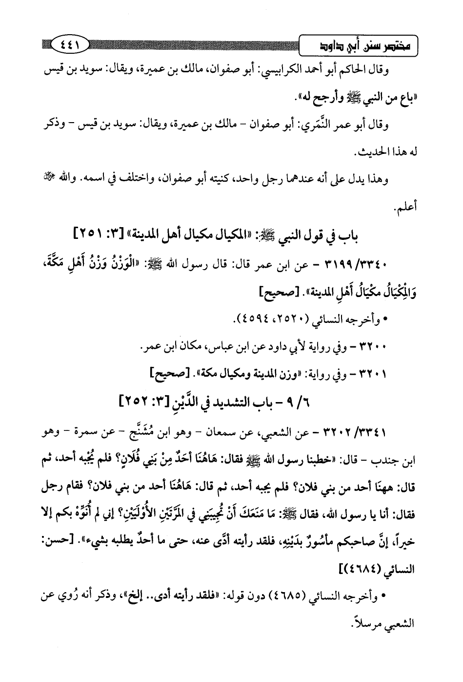 3340/ 3199 - عن ابن عمر قال: قال رسول اللَّه -صلى اللَّه عليه وسلم-: "الْوَزْنُ وَزْنُ أَهْلِ مَكَّةَ، وَالمكْيَالُ مكْيَالُ أَهْلِ المدينة".hصحيح]