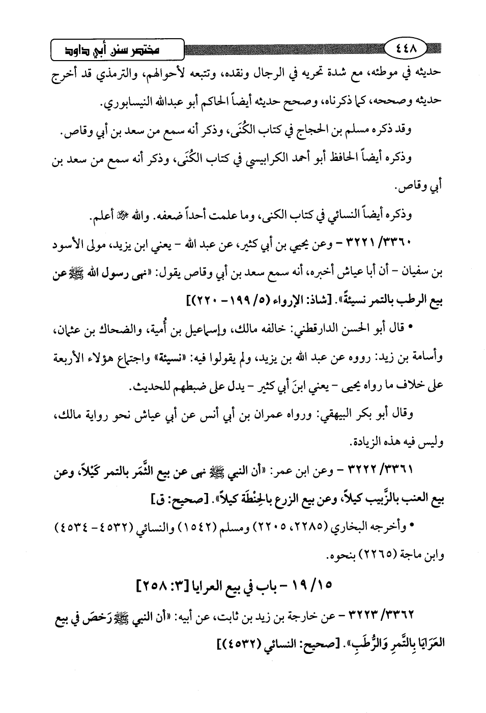 3360/ 3221 - وعن يحيى بن أبي كثير، عن عبد اللَّه -يعني ابن يزيد، مولى الأسود بن سفيان- أن أبا عياش أخبره، أنه سمع سعد بن أبي وقاص يقول: "نهى رسول اللَّه -صلى اللَّه عليه وسلم- عن بيع الرطب بالتمر نسيئةً".hشاذ: الإرواء (5/ 199 - 220)]