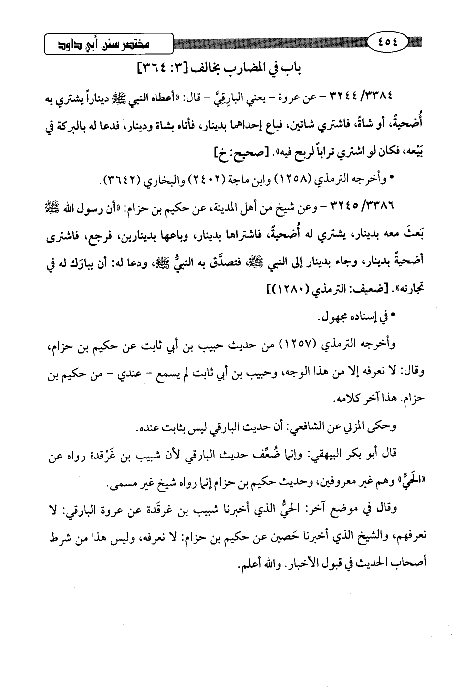 3386/ 3245 - وعن شيخ من أهل المدينة، عن حكيم بن حزام: "أن رسول -صلى اللَّه عليه وسلم- بَعثَ معه بدينار، يشتري له أُضحيةً، فاشتراها بدينار، وباعها بدينارين، فرجع، فاشترى أضحيةً بدينار، وجاء بدينار إلى النبي -صلى اللَّه عليه وسلم-، فتصدَّق به النبيُّ -صلى اللَّه عليه وسلم-، ودعا له: أن يبارَك له في تجارته".hضعيف: الترمذي (1280)]