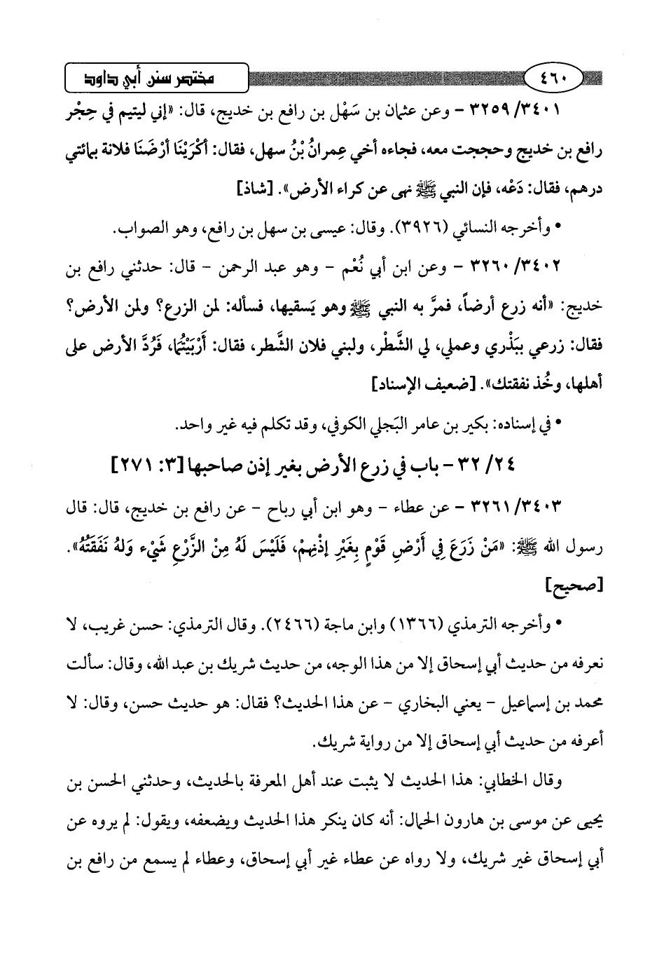 3401/ 3259 - وعن عثمان بن سَهْل بن رافع بن خديج، قال: "إني ليتيم في حِجْر رافع بن خديج وحججت معه، فجاءه أخي عِمرانُ بْنُ سهل، فقال: أكْرَيْنَا أرْضَنَا فلانة بمائتي درهم، فقال: دَعْه، فإن النبي -صلى اللَّه عليه وسلم- نهى عن كراء الأرض".hشاذ]