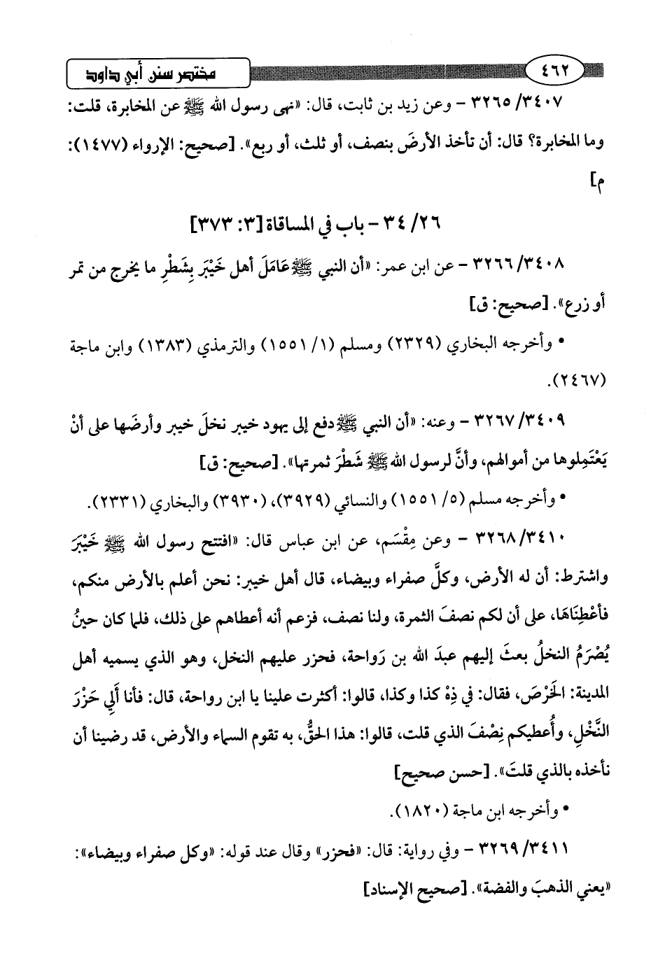 3410/ 3268 - وعن مِقْسَم، عن ابن عباس قال: "افتتح رسول اللَّه -صلى اللَّه عليه وسلم-خَيْبَرَ واشترط: أن له الأرض، وكلَّ صفراء وبيضاء، قال أهل خيبر: نحن أعلم بالأرض منكم، فأعْطِنَاهَا، على أن لكم نصفَ الثمرة، ولنا نصف، فزعم أنه أعطاهم على ذلك، فلما كان حينُ يُصْرَمُ النخلُ بعثَ إليهم عبدَ اللَّه بن رَواحة، فحزر عليهم النخل، وهو الذي يسميه أهل المدينة: الخَرْصَ، فقال: في ذِهْ كذا وكذا، قالوا: أكثرت علينا يا ابن رواحة، قال: فأنا أَلِي حَزْرَ النَّخْلِ، وأُعطيكم نِصْفَ الذي قلت، قالوا: هذا الحقُّ، به تقوم السماء والأرض، قد رضينا أن نأخذه بالذي قلتَ".hحسن صحيح]