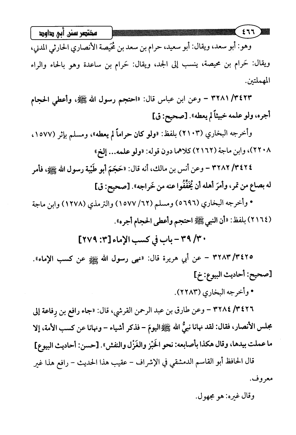 3424/ 3282 - وعن أنس بن مالك، أنه قال: "حَجَمَ أبو طَيْبة رسول اللَّه -صلى اللَّه عليه وسلم-، فأمر له بصاع من تمر، وأمرَ أهله أن يُخَفِّفُوا عنه من خَراجه".hصحيح: ق]