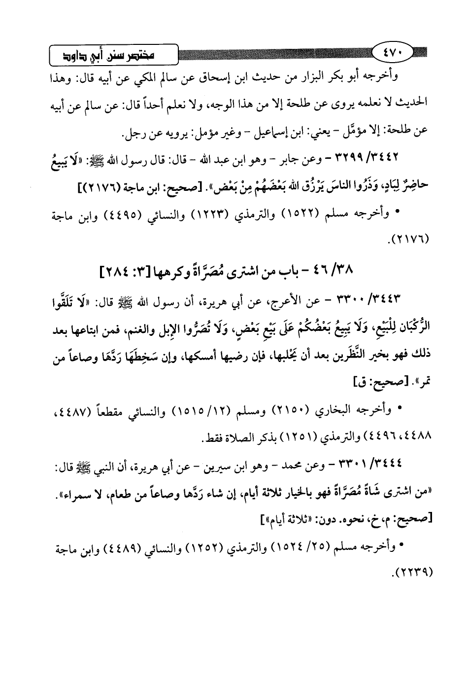 3443/ 3300 - عن الأعرج، عن أبي هريرة، أن رسول اللَّه -صلى اللَّه عليه وسلم-قال: "لَا تَلَقَّوا الرُّكبَان لِلْبَيْعِ، وَلَا يَبِيعُ بَعْضُكُمْ عَلَى بَيع بَعْضٍ، وَلَا تُصَرُّوا الإِبل والغنم، فمن ابتاعها بعد ذلك فهو بخير النَّظَرين بعد أن يَحْلبها، فإن رضيها أمسكها، وإن سَخِطَهَا رَدَّهَا وصاعًا من تمر".hصحيح: ق]