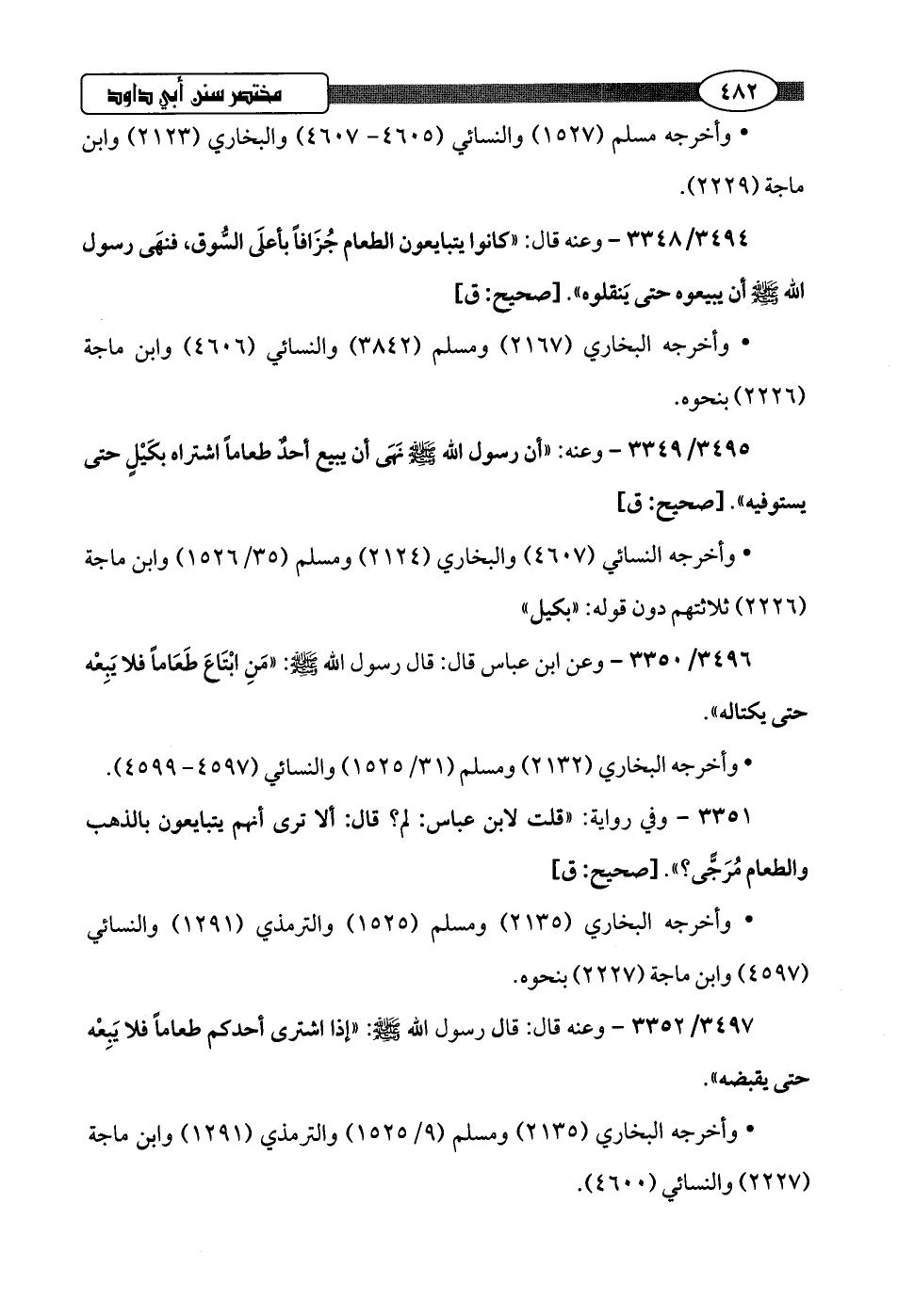 3496/ 3350 - وعن ابن عباس قال: قال رسول اللَّه -صلى اللَّه عليه وسلم-: "مَنِ ابْتَاعَ طَعَامًا فلا يَبِعْه حتى يكتاله".