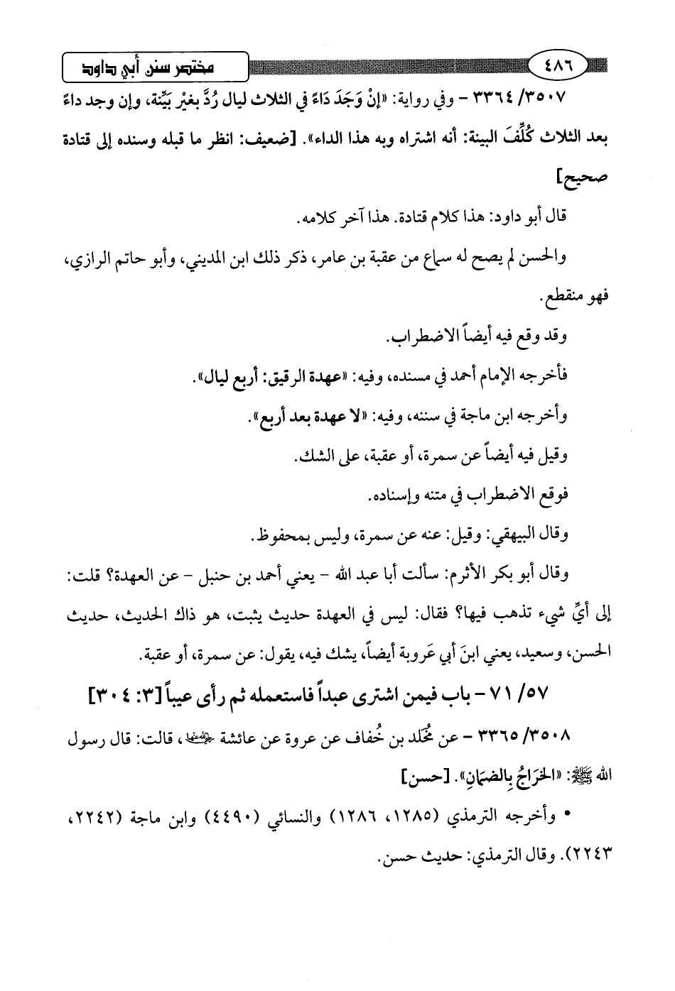 3507/ 3364 - وفي رواية: "إنْ وَجَدَ دَاءً في الثلاث ليال رُدَّ بغيْر بَيِّنة، وإن وجد داءً بعد الثلاث كُلِّفَ البينة: أنه اشتراه وبه هذا الداء".hضعيف: انظر ما قبله وسنده إلى قتادة صحيح]
