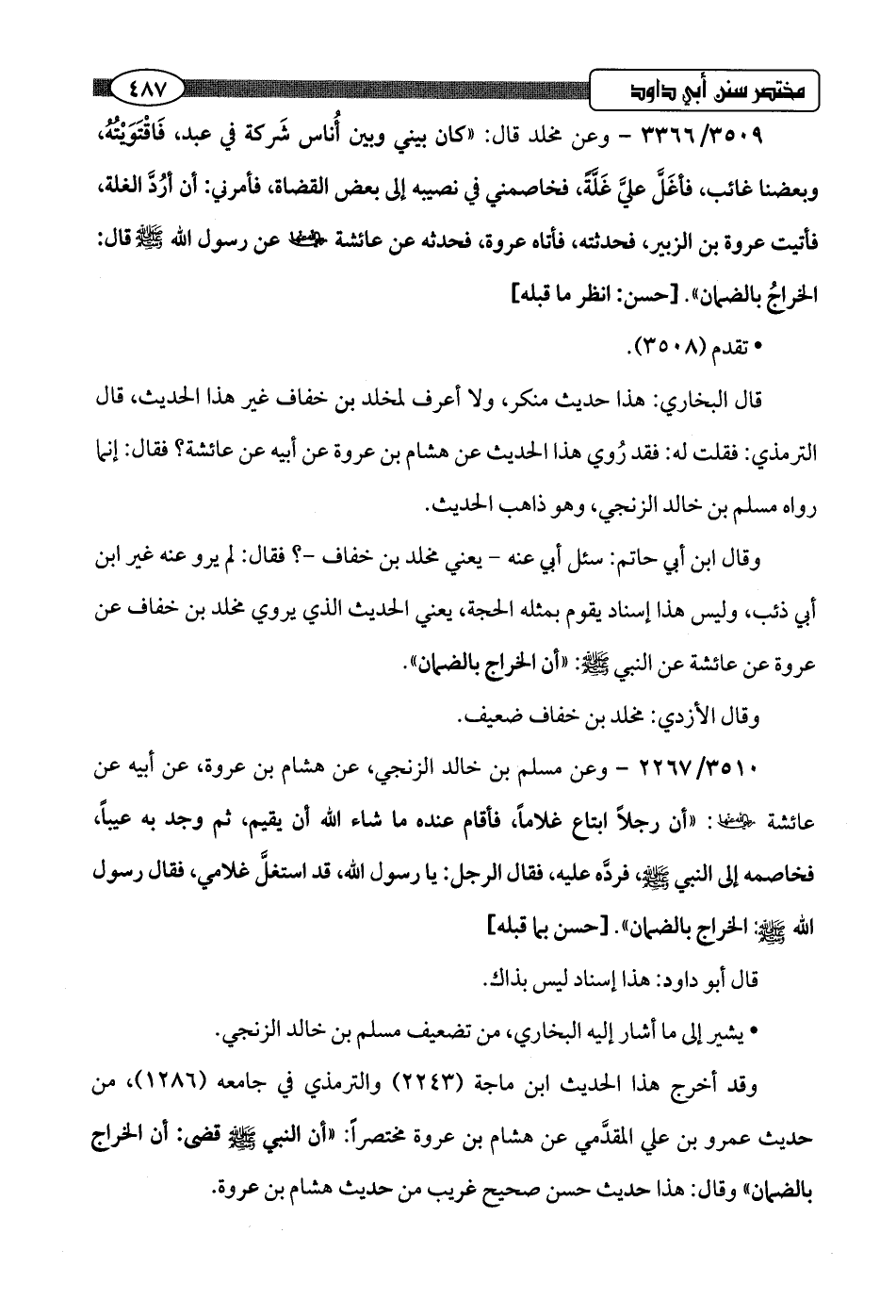 3509/ 3366 - وعن مخلد قال: "كان بيني وبين أُناس شَركة في عبد، فَاقْتَويْتُهُ وبعضنا غائب، فأغَلَّ عليَّ غَلَّةً، فخاصمني في نصيبه إلى بعض القضاة، فأمرني: أن أرُدَّ الغلة، فأتيت عروة بن الزبير، فحدثته، فأتاه عروة، فحدثه عن عائشة -رضي اللَّه عنها- عن رسول اللَّه -صلى اللَّه عليه وسلم- قال: الخراجُ بالضمان".hحسن: انظر ما قبله]