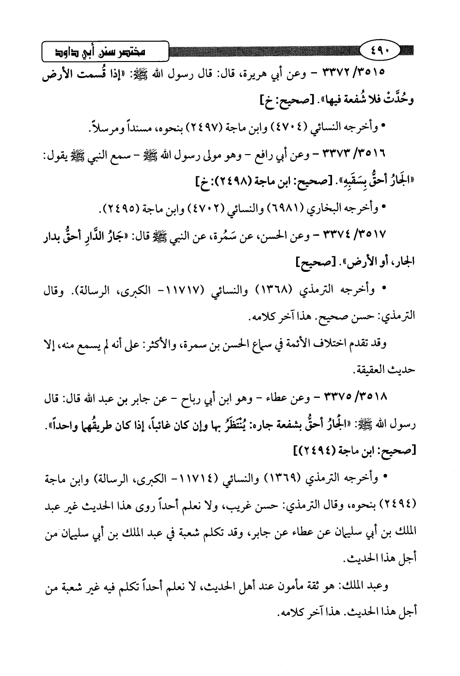 3516/ 3373 - وعن أبي رافع -وهو مولى رسول اللَّه -صلى اللَّه عليه وسلم- سمع النبي -صلى اللَّه عليه وسلم- يقول "الجَارُ أحقُّ بِسَقَبِهِ".hصحيح: ابن ماجة (2498): خ]