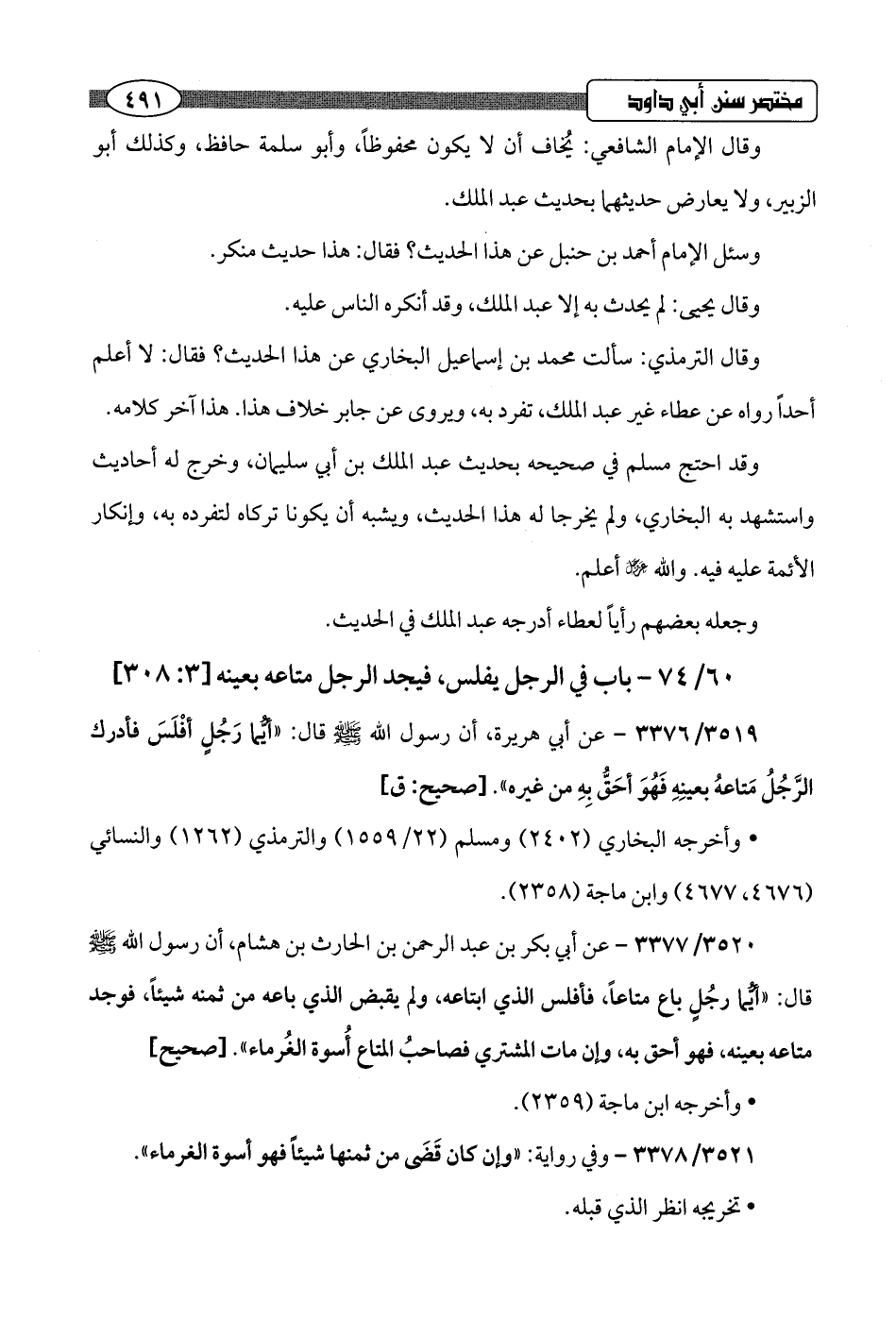 3519/ 3376 - عن أبي هريرة، أن رسول اللَّه -صلى اللَّه عليه وسلم-قال: "أيُّما رَجُلٍ أفْلَسَ فأدرك الرَّجُلُ مَتاعهُ بعينِهِ فَهُوَ أحَقُّ بِهِ من غيره".hصحيح: ق]