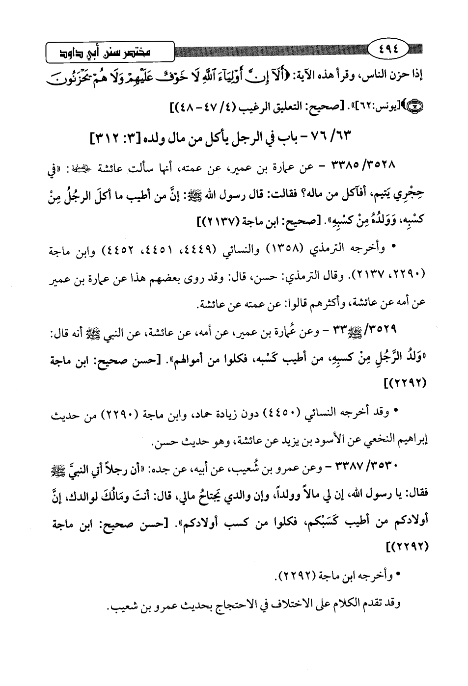 3529/ 3386 - وعن عُمارة بن عمير، عن أمه، عن عائشة، عن النبي -صلى اللَّه عليه وسلم- أنه قال: "ولدُ الرَّجُلِ مِنْ كسبِهِ، من أطيب كَسْبه، فكلوا من أموالهم".hحسن صحيح: ابن ماجة (2292)]