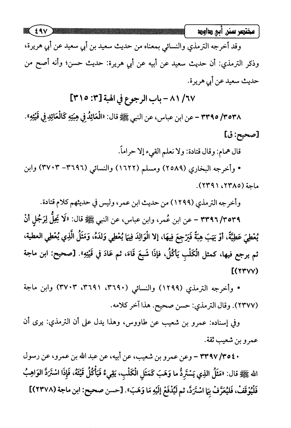 3538/ 3395 - عن ابن عباس، عن النبي -صلى اللَّه عليه وسلم- قال: "الْعَائِدُ فِي هِبَتِهِ كَالْعَائِدِ فِي قَيْئِهِ".hصحيح: ق]
