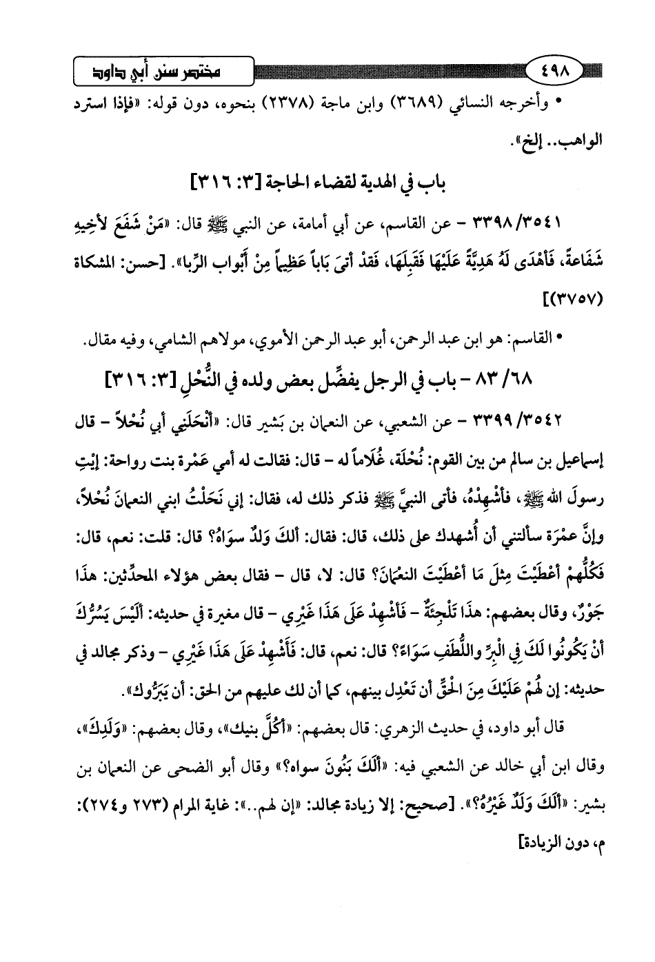 3542/ 3399 - عن الشعبي، عن النعمان بن بَشير قال: "أنحَلَني أبي نُحْلًا -قال إسماعيل بن سالم من بين القوم: نُحْلَة، غُلامًا له- قال: فقالت له أمي عَمْرة بنت رواحة: إيْتِ رسولَ اللَّه -صلى اللَّه عليه وسلم-، فأشْهِدْهُ، فأتى النبيَّ -صلى اللَّه عليه وسلم- فذكر ذلك له، فقال: إني نَحَلْتُ ابني النعمانَ نُحْلًا، وإنَّ عمْرَة سأْلتني أن أُشهدك على ذلك، قال: فقال: ألكَ وَلدٌ سوَاهُ؟ قال: قلت: نعم، قال: فكُلُّهمْ أعْطَيْتَ مِثلَ مَا أعْطَيْتَ النعْمَانَ؟ قال: لا، قال -فقال بعض هؤلاء المحدِّثين: هذَا جَوْرٌ، وقال بعضهم: هذَا تَلْجِئةٌ- فَأشْهِدْ عَلَى هَذَا غيرِي -قال مغيرة في حديثه: ألَيْسَ يَسُرُّكَ أنْ يَكُونُوا لَكَ فِي الْبِرِّ واللُّطَفِ سَوَاءً؟ قال: نعم، قال: فَأَشْهِدْ عَلَى هَذَا غيرِي- وذكر مجالد في حديثه: إن لهُمْ عَلَيْكَ مِنَ الحْقِّ أن تَعْدِل بينهم، كما أن لك عليهم من الحق: أن يَبَرُّوك".