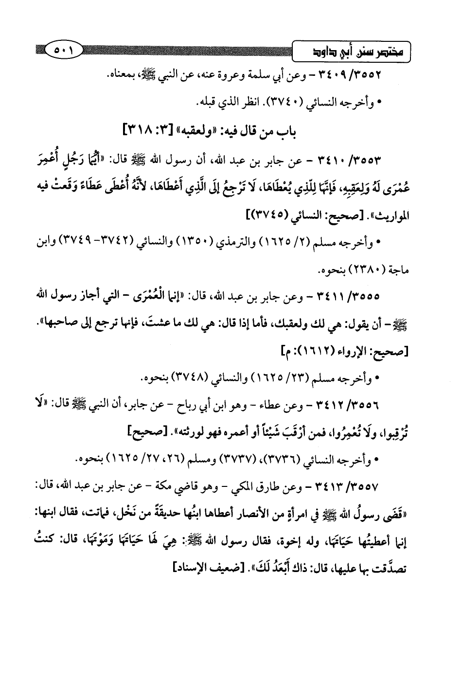 3556/ 3412 - وعن عطاء -وهو ابن أبي رباح- عن جابر، أن النبي -صلى اللَّه عليه وسلم- قال: "لَا تُرْقِبوا، ولَا تُعْمِرُوا، فمن أرْقَبَ شَيْئًا أو أعمره فهو لورثته".hصحيح]
