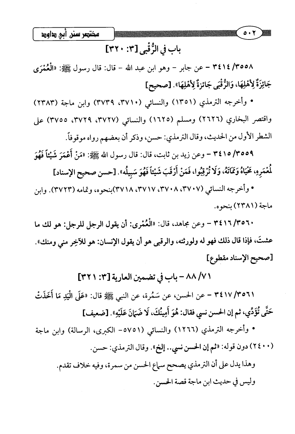 3559/ 3415 - وعن زيد بن ثابت، قال: قال رسول اللَّه -صلى اللَّه عليه وسلم- مَن أَعْمَرَ شَيْئًا فَهُوَ لمُعْمَرِهِ، مَحْيَاهُ وَمَماتَهُ، وَلَا تُرْقِبُوا، فَمَنْ أَرْقَبَ شَيْئًا فَهُوَ سَبِيلُه".hحسن صحيح الإسناد]