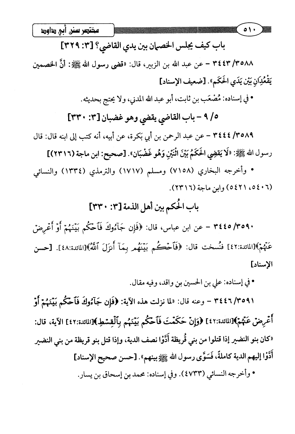 3588/ 3443 - عن عبد اللَّه بن الزبير، قال: "قضى رسول اللَّه -صلى اللَّه عليه وسلم-: أنَّ الخصمين يَقْعُدِانِ بَيْن يَدَي الحَكَم".hضعيف الإسناد]
