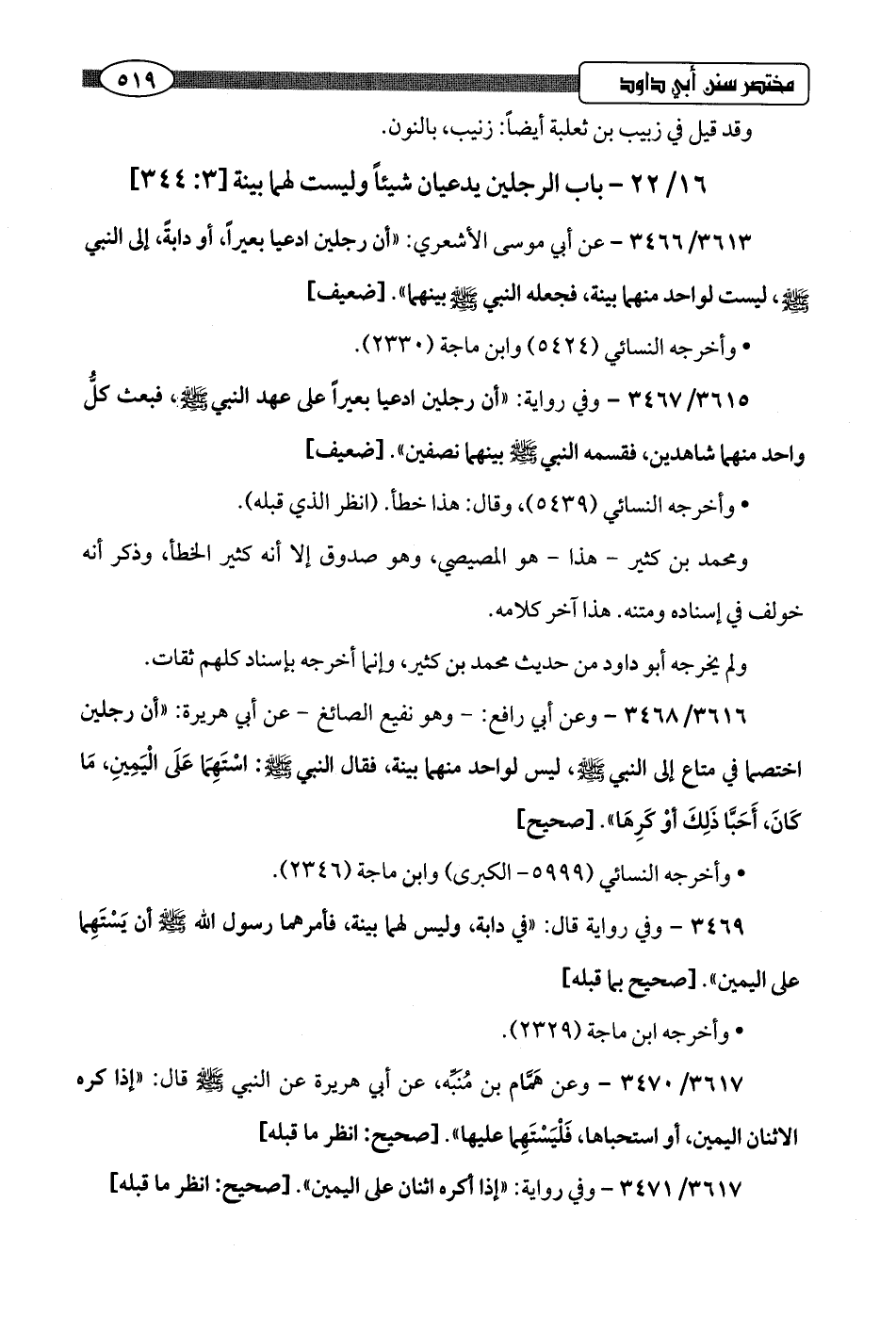 3613/ 3466 - عن أبي موسى الأشعري: "أن رجلين ادعيا بعيرًا، أو دابة، إلى النبي -صلى اللَّه عليه وسلم-، ليست لواحد منهما بينة، فجعله النبي -صلى اللَّه عليه وسلم- بينهما".hضعيف]