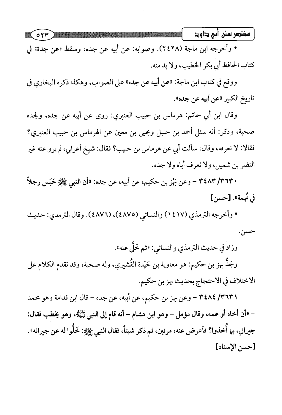 3630/ 3483 - وعن بَهْز بن حكيم، عن أبيه، عن جده: "أن النبي -صلى اللَّه عليه وسلم- حَبَس رجلًا في تُهمة".hحسن]