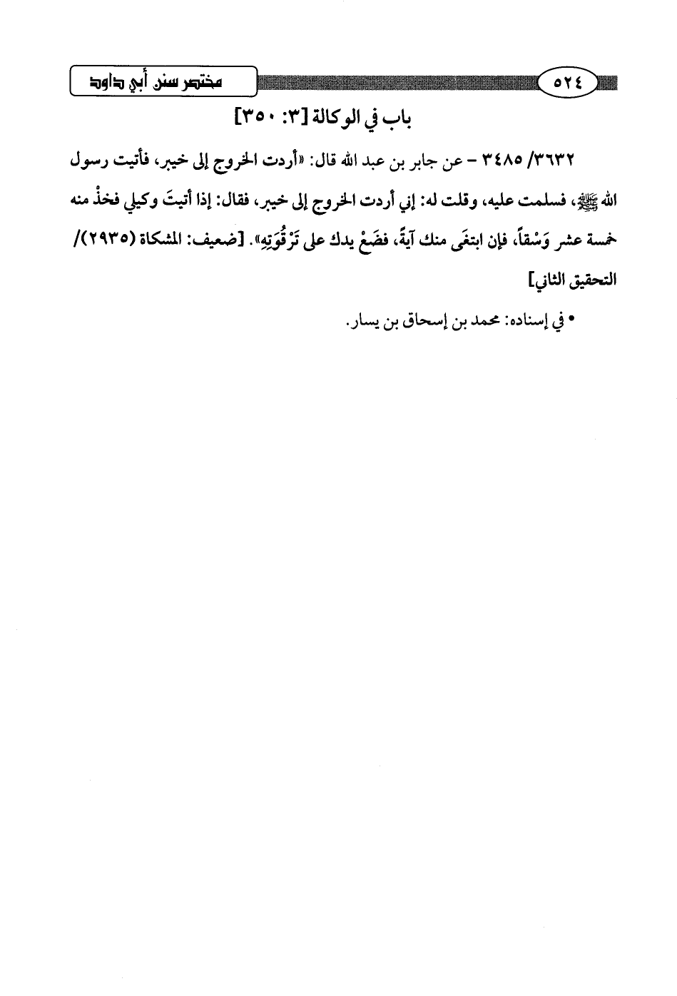 3632/ 3485 - عن جابر بن عبد اللَّه قال: "أردت الخروج إلى خيبر، فأتيت رسول اللَّه -صلى اللَّه عليه وسلم-، فسلمت عليه، وقلت له: إني أردت الخروج إلى خيبر، فقال: إذا أتيتَ وكيلي فخذْ منه خمسة عشر وَسْقًا، فإن ابتغَى منك آيةً، فضَعْ يدك على تَرْقُوَتِهِ".hضعيف: المشكاة (2935) / التحقيق الثاني]