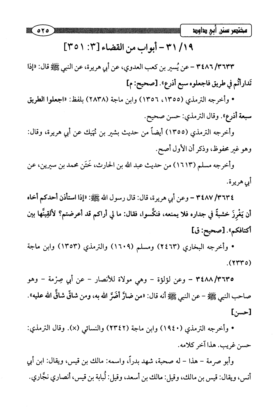 3633/ 3486 - عن يُسير بن كعب العدوي، عن أبي هريرة، عن النبي -صلى اللَّه عليه وسلم- قال: "إذا تَدارأتُم في طريق فاجعلوه سبع أذرع".hصحيح: م]