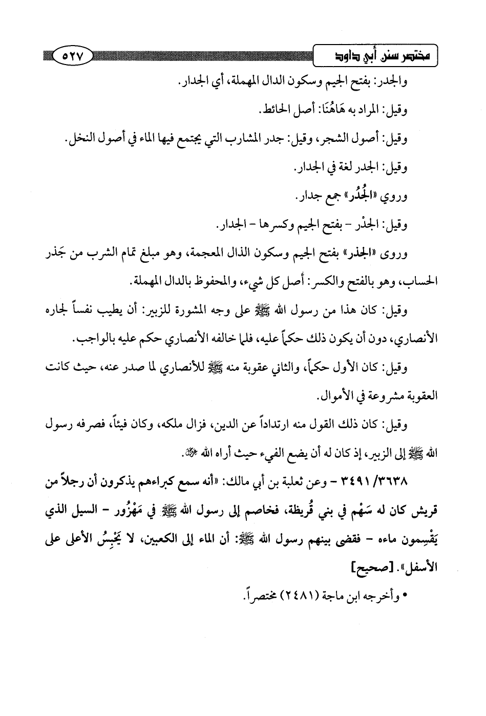 3638/ 3491 - وعن ثعلبة بن أبي مالك: "أنه سمع كبراءهم يذكرون أن رجلًا من قريش كان له سَهْم في بني قُريظة، فخاصم إلى رسول اللَّه -صلى اللَّه عليه وسلم- في مَهْزُور -السيل الذي يَقْسِمون ماءه- فقضى بينهم رسول اللَّه -صلى اللَّه عليه وسلم-: أن الماء إلى الكعبين، لا يَحْبِسُ الأعلى على الأسفل".hصحيح]
