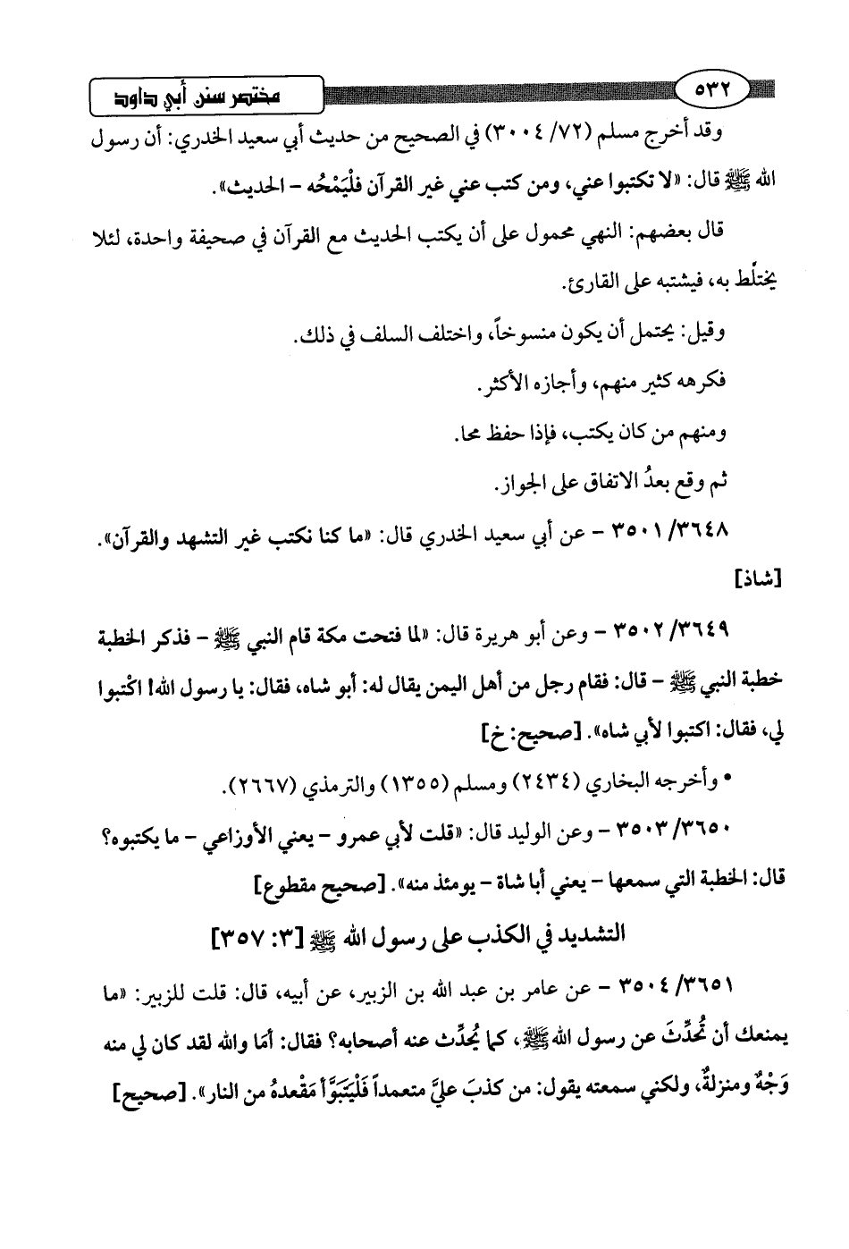 3650/ 3503 - وعن الوليد قال: "قلت لأبي عمرو -يعني الأوزاعي- يحيى -ما يكتبوه؟ قال: الخطبة التي سمعها -يعني أبا شاة- يومئذ منه".hصحيح مقطوع]