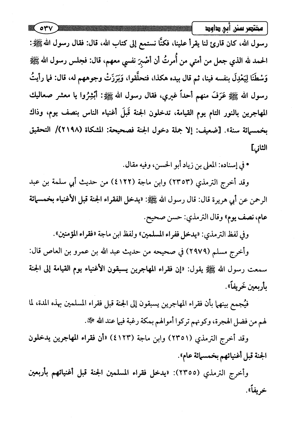 وفي لفظ الترمذي: "يدخل فقراء المسلمين" ولفظ ابن ماجة "فقراء المؤمنين".