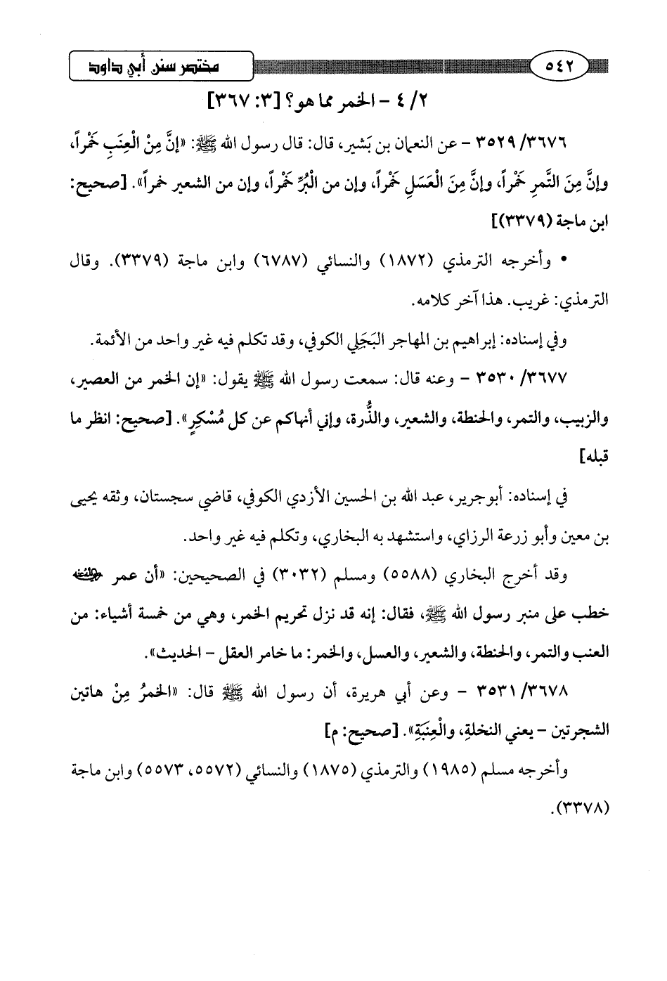 3676/ 3529 - عن النعمان بن بَشير، قال: قال رسول اللَّه -صلى اللَّه عليه وسلم-: "إنَّ مِنْ الْعِنَبِ خَمْرًا، وإنَّ مِنَ التَّمرِ خَمْرًا، وإنَّ مِنَ الْعَسَلِ خَمْرًا، وإن من الْبُرِّ خَمْرًا، وإن من الشعير خمرًا".hصحيح: ابن ماجة (3379)]