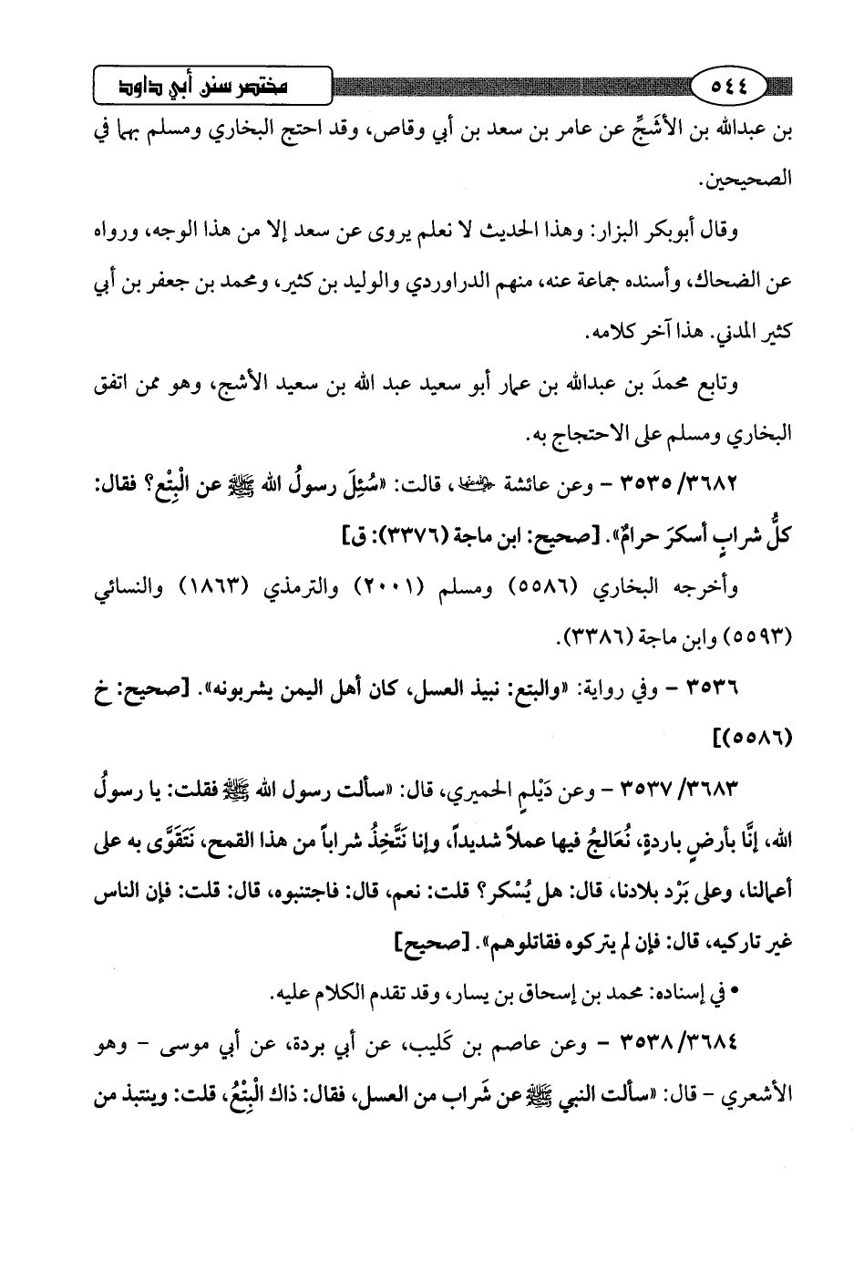 3684/ 3538 - وعن عاصم بن كَليب، عن أبي بردة، عن أبي موسى -وهو الأشعري- قال: "سألت النبي -صلى اللَّه عليه وسلم- عن شَراب من العسل، فقال: ذاك الْبِتْعُ، قلت: وينتبذ من