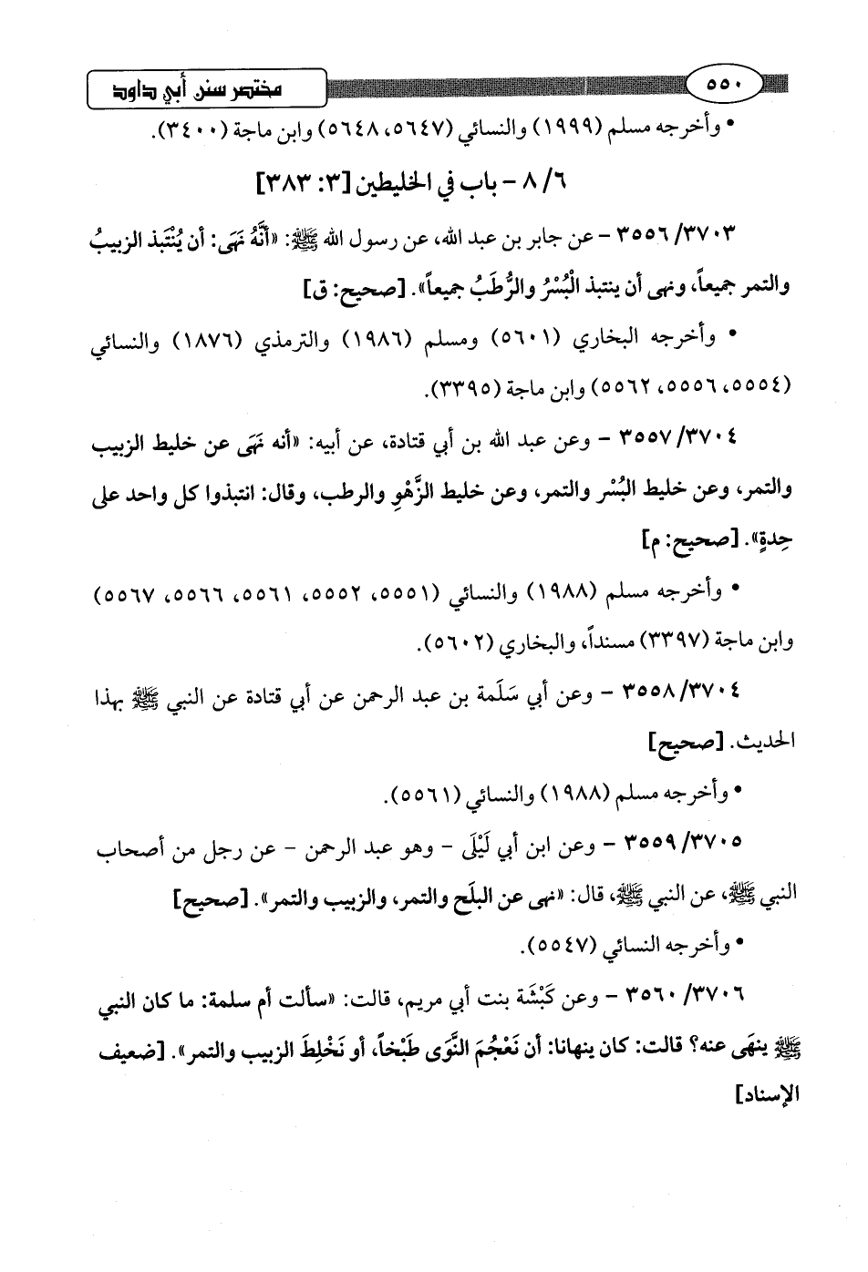 3703/ 3556 - عن جابر بن عبد اللَّه، عن رسول اللَّه -صلى اللَّه عليه وسلم-: "أَنَّهُ نَهَى: أن يُنْتَبذ الزبيبُ والتمر جميعًا، ونهى أن ينتبذ الْبُسْرُ والرُّطَبُ جميعًا".hصحيح: ق]