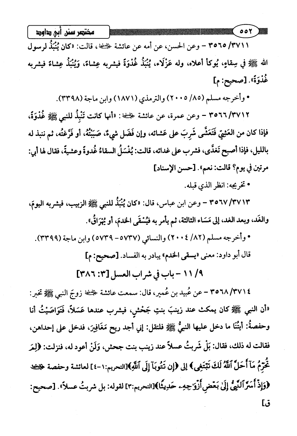 3712/ 3566 - وعن عمرة، عن عائشة -رضي اللَّه عنها-: "أنها كانت تَنْبِذُ للنبي -صلى اللَّه عليه وسلم- غُدْوَةً، فإذا كان من العَشِيّ فَتَعَشَّى شَرِبَ على عَشائه، وإن فَضَل شيءٌ، صَبَبْتُهُ، أو فَرَّغتُه، ثم ننبذ له بالليل، فإذا أصبح تَغدَّى، فشرب على غدائه، قالت: يُغْسَلُ السقاءُ غُدوةَ وعشيةً، فقال لها أبي: مرتين في يوم؛ قالت: نعم".hحسن الإسناد]