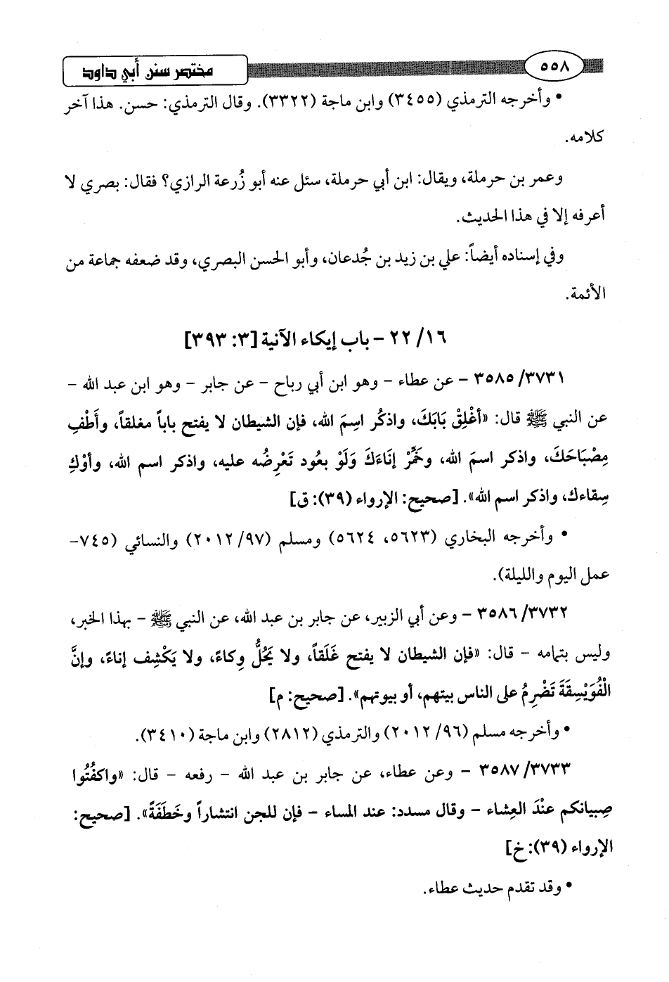 3731/ 3585 - عن عطاء -وهو ابن أبي رباح- عن جابر -وهو ابن عبد اللَّه- عن النبي -صلى اللَّه عليه وسلم- قال: "أغْلِقْ بَابَكَ، واذكُر اسِمَ اللَّه، فإن الشيطان لا يفتح بابًا مغلقًا، وأَطْفِ مِصْبَاحَكَ، واذكر اسمَ اللَّه، وخَمِّرْ إنَاءَكَ وَلَوْ بعُود تَعْرِضُه عليه، واذكر اسم اللَّه، وأوْكِ سِقاءك، واذكر اسم اللَّه".hصحيح: الإرواء (39): ق]