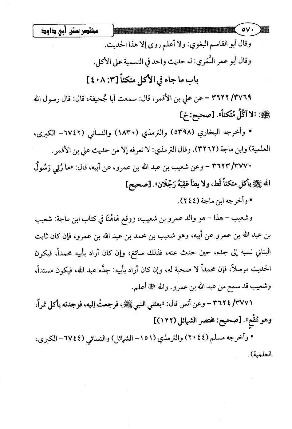 3770/ 3623 - وعن شعيب بن عبد اللَّه بن عمرو، عن أبيه، قال: "ما رُئِي رَسُولُ اللَّه -صلى اللَّه عليه وسلم- يأكل متكئًا قَط، ولا يطأ عَقِبَهُ رَجُلَان".hصحيح]