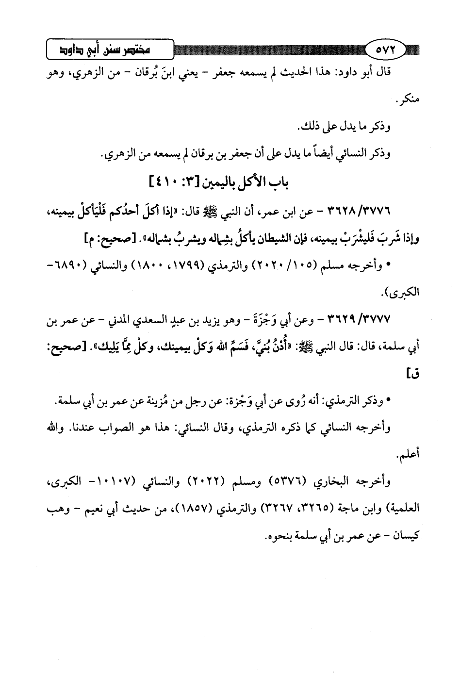 3777/ 3629 - وعن أبي وَجْزَةَ -وهو يزيد بن عبدٍ السعدي المدني- عن عمر بن أبي سلمة، قال: قال النبي -صلى اللَّه عليه وسلم-: "أُدْنُ بُنيَّ، فَسَمِّ اللَّه وَكلْ بيمينك، وكلْ مِمَّا يَلِيك".hصحيح: ق]