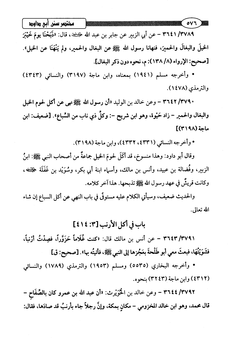 3790/ 3642 - وعن خالد بن الوليد "أن رسول اللَّه -صلى اللَّه عليه وسلم- نهى عن أكل لحوم الخيل والبغال والحمير -زاد حَيْوة، وهو ابن شريح-: وكلِّ ذي ناب من السِّباع".hضعيف: ابن ماجة (3198)]