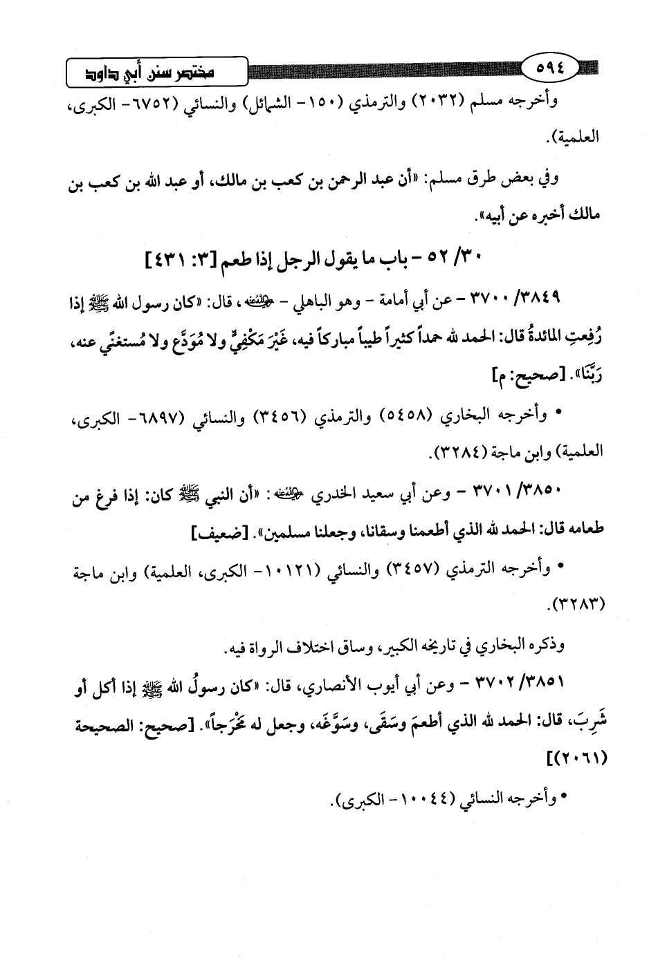 3849/ 3700 - عن أبي أمامة -وهو الباهلي -رضي اللَّه عنه-، قال: "كان رسول اللَّه -صلى اللَّه عليه وسلم- إذا رُفِعتِ المائدةُ قال: الحمد للَّه حمدًا كثيرًا طيبًا مباركًا فيه، غيْرَ مَكْفِيٍّ ولا مُوَدَّع ولا مُستغني عنه، رَبَّنَا".hصحيح: م]