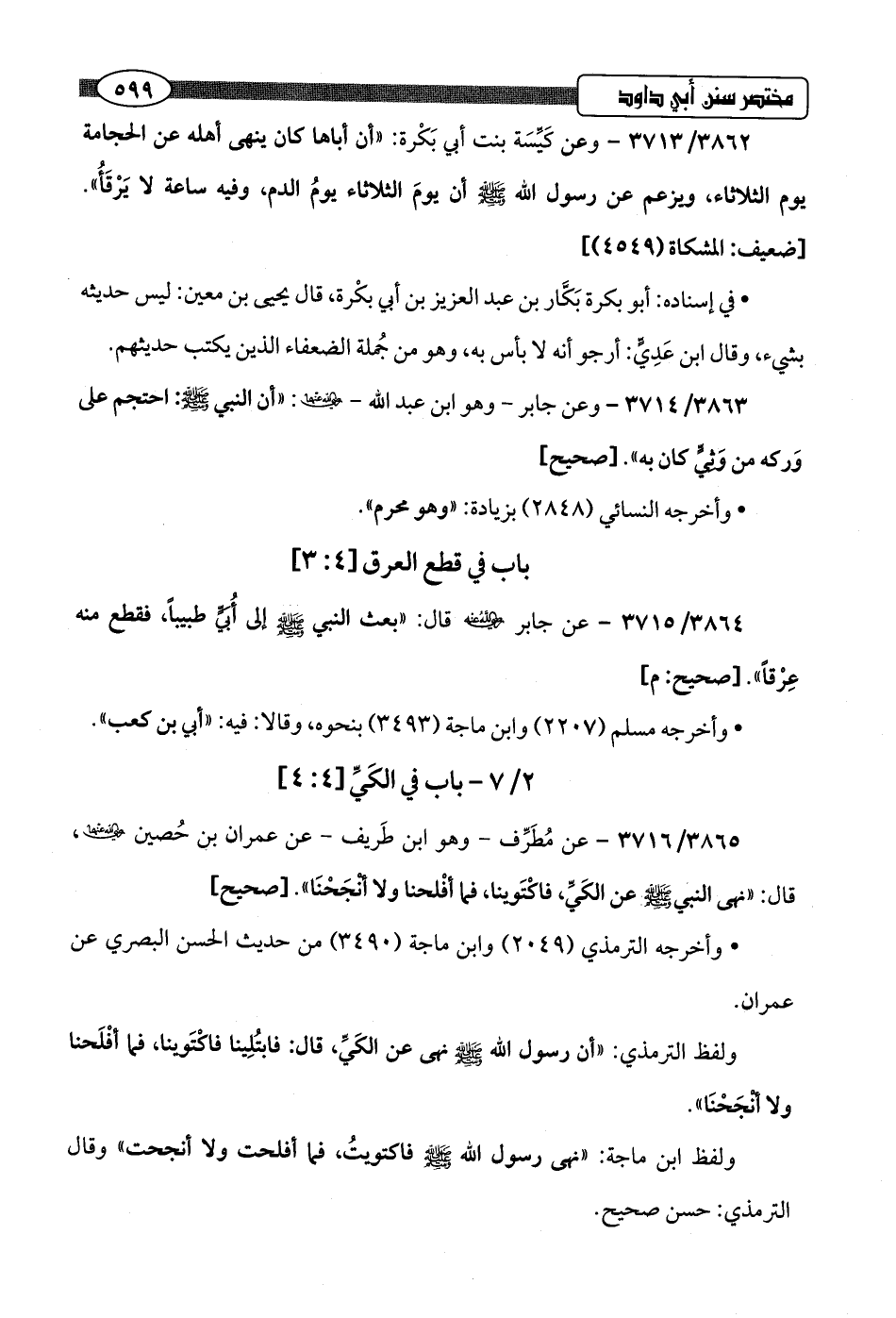 3865/ 3716 - عن مُطَرِّف -وهو ابن طَريف- عن عمران بن حُصين -رضي اللَّه عنهما-، قال: "نهى النبي -صلى اللَّه عليه وسلم- عن الكَيِّ، فاكْتَوينا، فما أفْلحنا ولا أنْجَحْنَا".hصحيح]