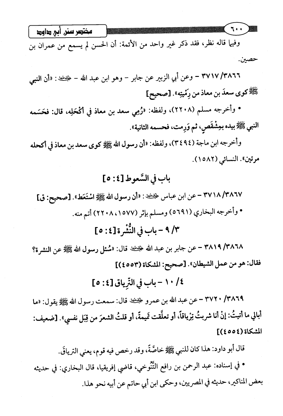 3866/ 3717 - وعن أبي الزبير عن جابر -وهو ابن عبد اللَّه - رضي اللَّه عنهما-: "أن النبي -صلى اللَّه عليه وسلم- كوى سعدَ بن معاذ من رَمْيتِه".hصحيح]