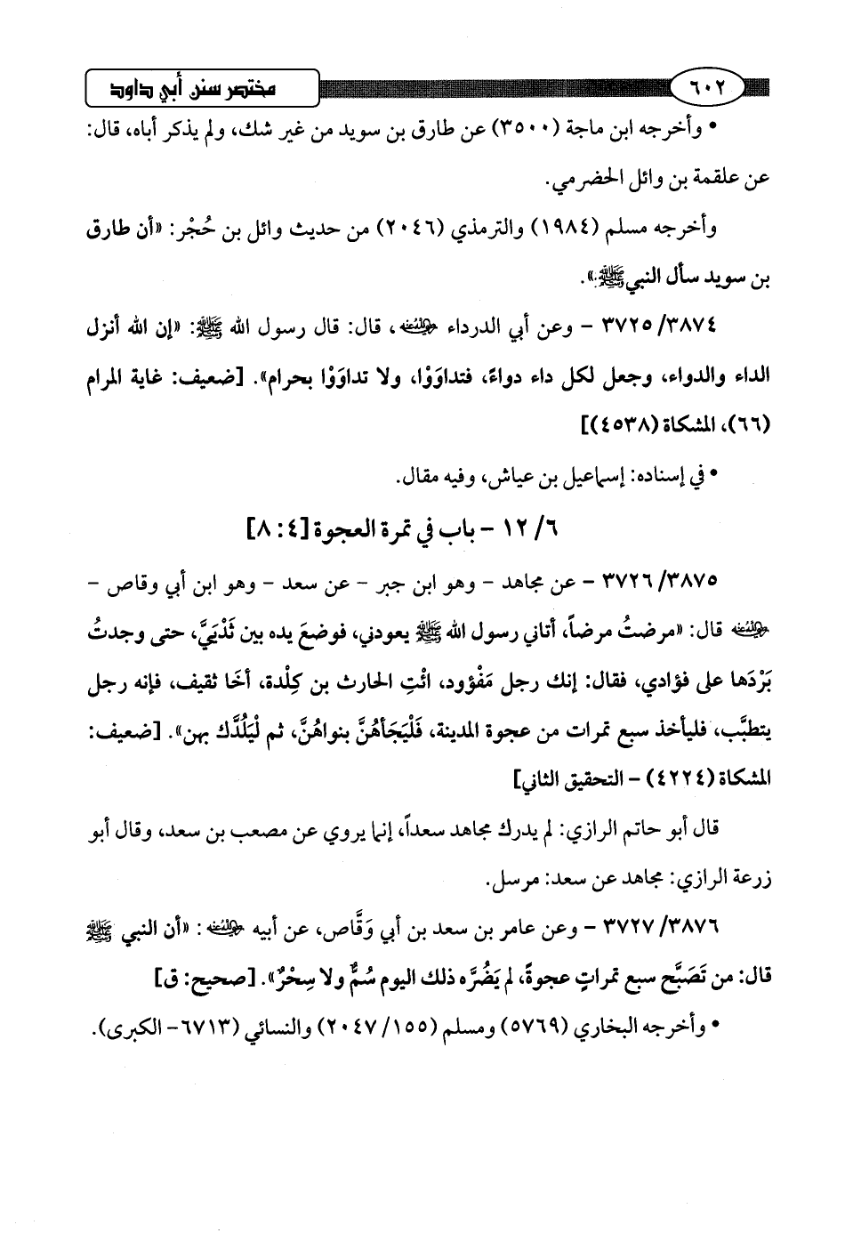 3875/ 3726 - عن مجاهد -وهو ابن جبر- عن سعد -وهو ابن أبي وقاص-رضي اللَّه عنه- قال: "مرضتُ مرضًا، أتاني رسول اللَّه -صلى اللَّه عليه وسلم- يعودني، فوضعَ يده بين ثَدْيَيَّ، حتى وجدتُ بَرْدَها على فؤادي، فقال: إنك رجل مَفْؤود، ائْتِ الحارث بن كِلْدة، أخَا ثقيف، فإنه رجل يتطبَّب، فليأخذ سبع تمرات من عجوة المدينة، فَلْيَجَأهُنَّ بنواهُنَّ، ثم لْيَلُدَّك بهن".hضعيف: المشكاة (4224) - التحقيق الثاني]