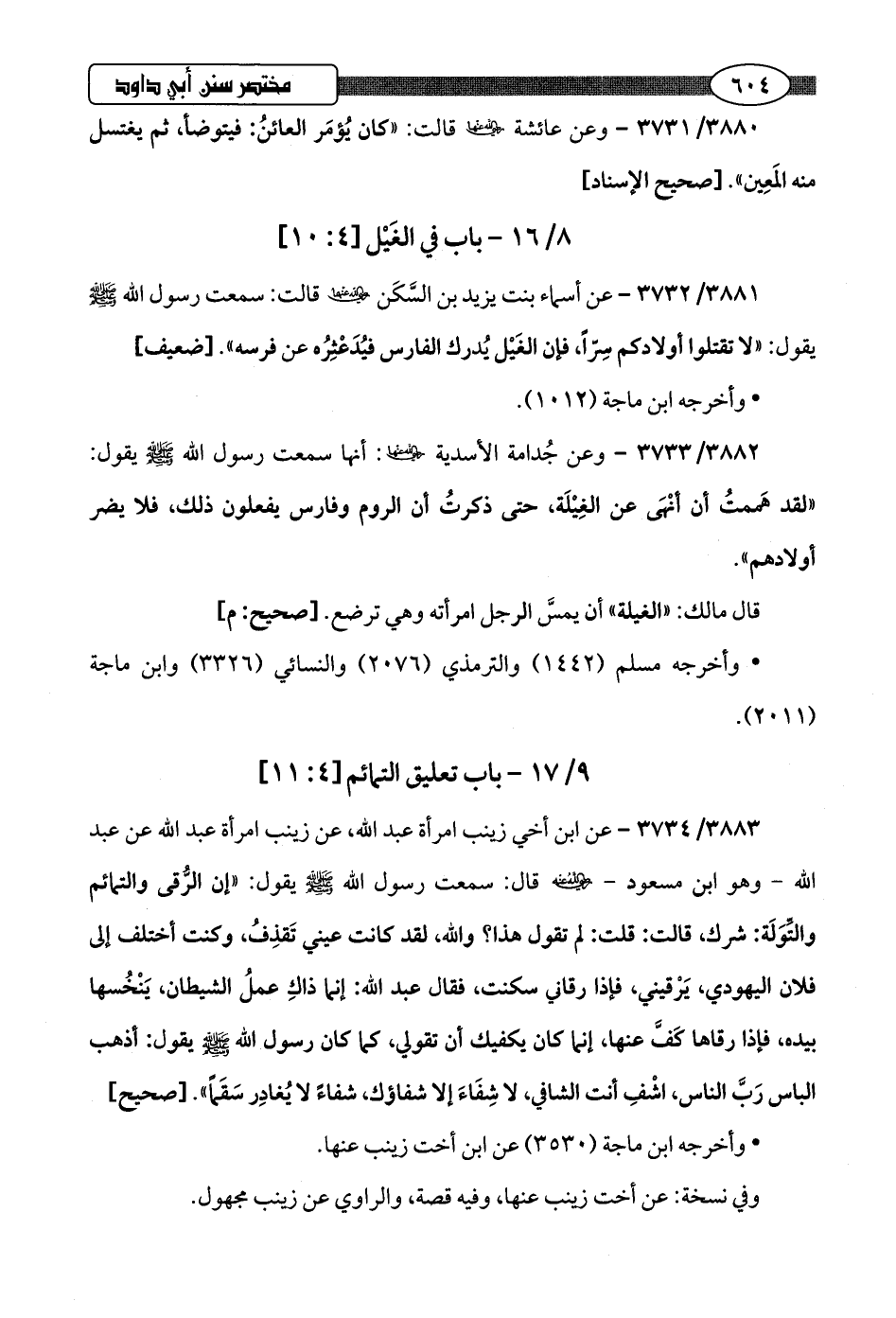 3883/ 3734 - عن ابن أخي زينب امرأة عبد اللَّه، عن زينب امرأة عبد اللَّه عن عبد اللَّه -وهو ابن مسعود -رضي اللَّه عنه- قال: سمعت رسول اللَّه -صلى اللَّه عليه وسلم- يقول: "إن الرُّقى والتمائم والتِّوَلَة: شرك، قالت: قلت: لم تقول هذا؟ واللَّه، لقد كانت عيني تَقذِفُ، وكنت أختلف إلى فلان اليهودي، يَرْقيني، فإذا رقاني سكنت، فقال عبد اللَّه: إنما ذاكِ عملُ الشيطان، يَنْخُسها بيده، فإذا رقاها كَفَّ عنها، إنما كان يكفيك أن تقولي، كما كان رسول اللَّه -صلى اللَّه عليه وسلم- يقول: أذهب الباس رَبَّ الناس، اشْفِ أنت الشافي، لا شِفَاءَ إلا شفاؤك، شفاءً لا يُغادِر سَقَمًا".hصحيح]