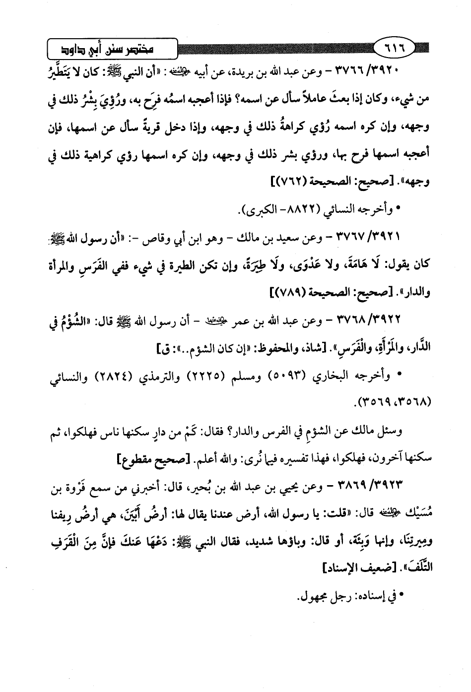 3922/ 3768 - وعن عبد اللَّه بن عمر -رضي اللَّه عنهما- أن رسول اللَّه -صلى اللَّه عليه وسلم- قال: "الشُؤْمُ في الدَّار، والمَرْأَةِ، والْفَرَسِ".hشاذ والمحفوظ: "إن كان الشؤم. .": ق]