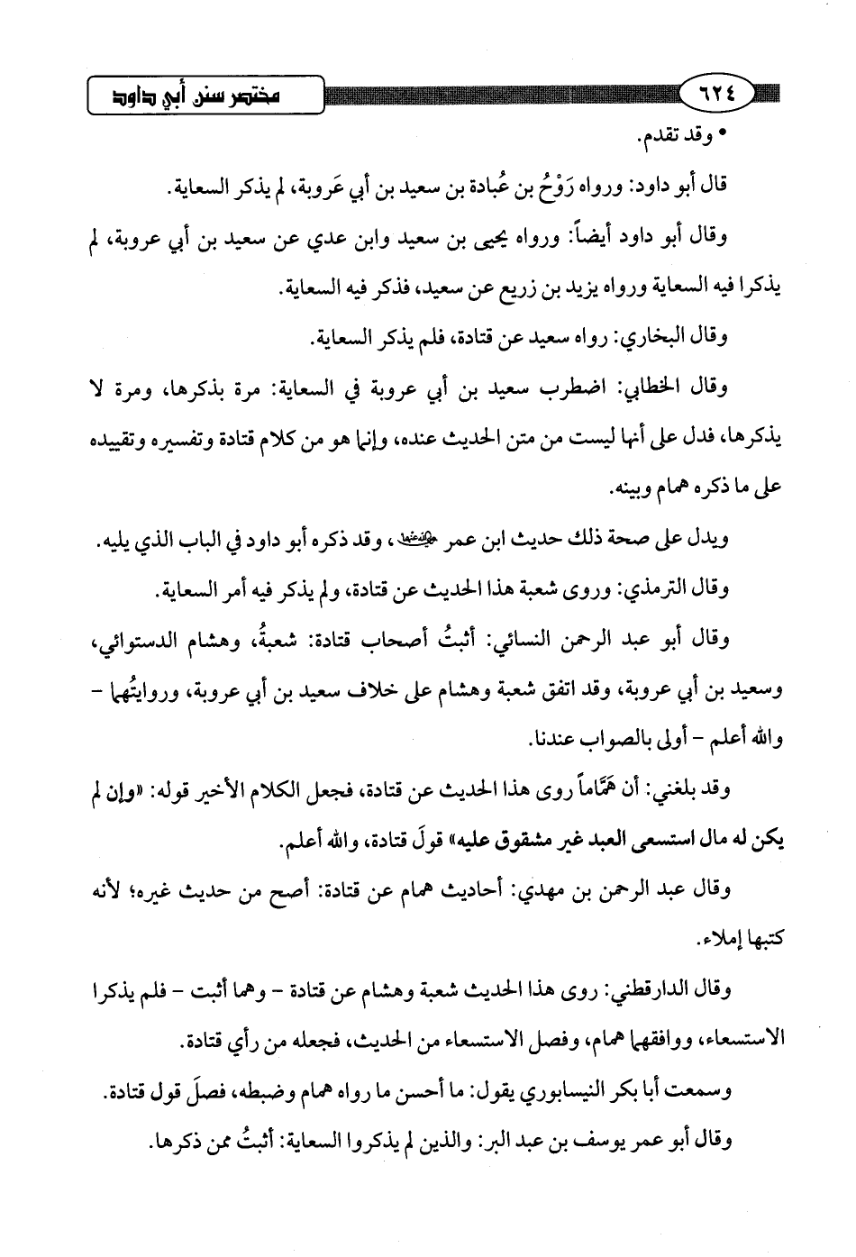 قال أبو داود: ورواه رَوْحُ بن عُبادة بن سعيد بن أبي عَروبة، لم يذكر السعاية.