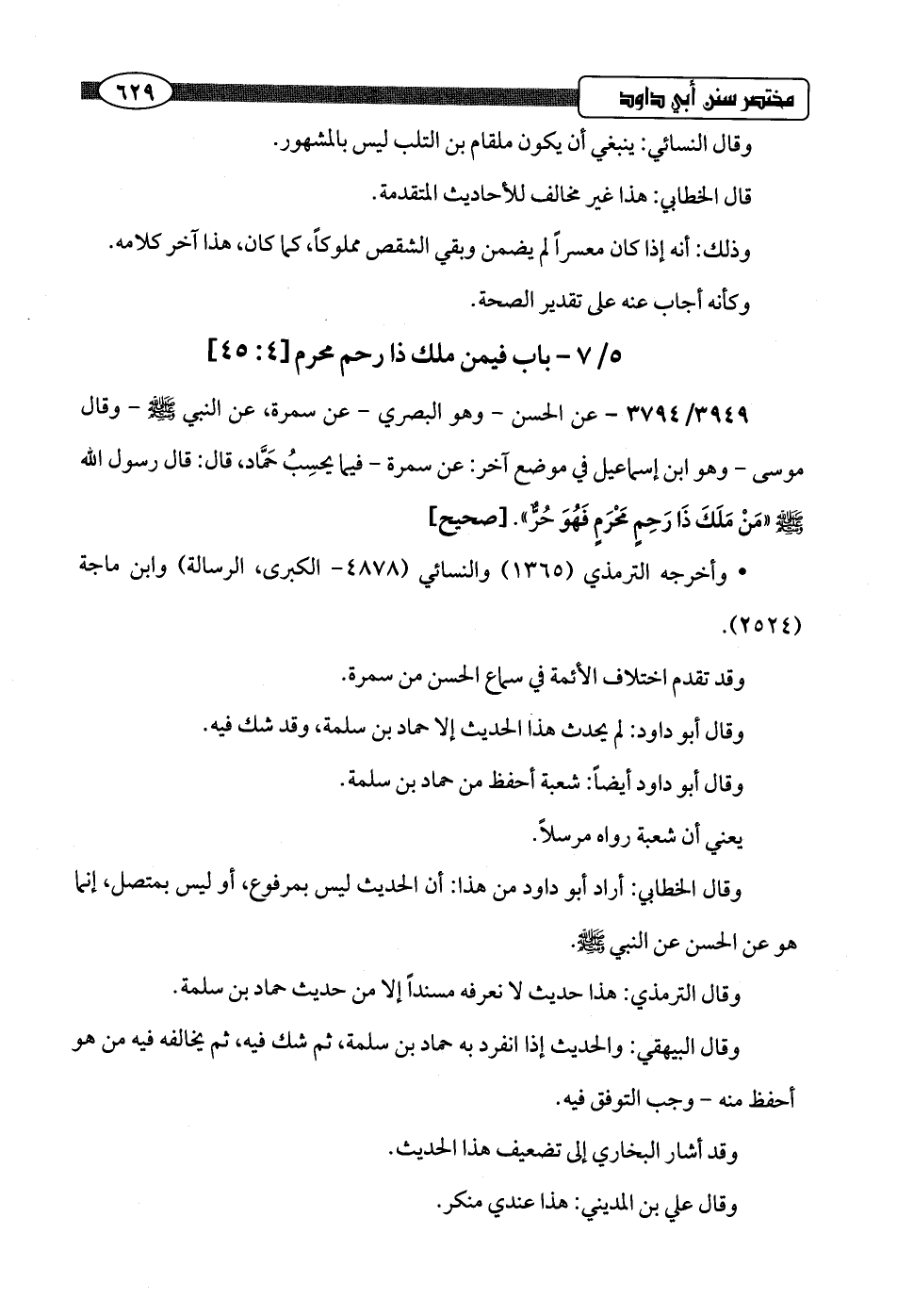 3949/ 3794 - عن الحسن -وهو البصري- عن سمرة، عن النبي -صلى اللَّه عليه وسلم- وقال موسى -وهو ابن إسماعيل في موضع آخر: عن سمرة- فيما يحسِبُ حَمَّاد، قال: قال رسول اللَّه -صلى اللَّه عليه وسلم- "مَنْ مَلَكَ ذَا رَحِمٍ مَحْرَمٍ فَهُوَ حُرٌّ".hصحيح]