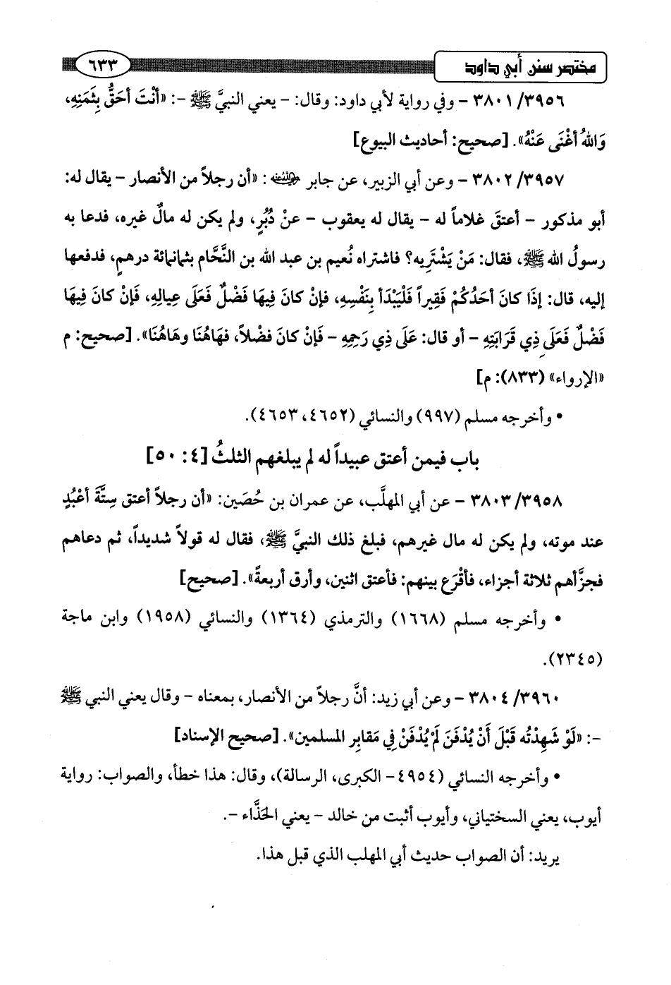 3958/ 3803 - عن أبي المهلَّب، عن عمران بن حُصَين: "أن رجلًا أعتق سِتَّةَ أعْبُدٍ عند موته، ولم يكن له مال غيرهم، فبلغ ذلك النبيَّ -صلى اللَّه عليه وسلم- فقال له قولًا شديدًا، ثم دعاهم فجزَّأهم ثلاثة أجزاء، فأقْرَع بينهم: فأعتق اثنين، وأرق أربعةً".hصحيح]