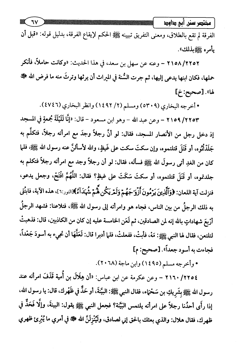 2253/ 2159 - وعن عبد اللَّه -وهو ابن مسعود- قال: "إنَّا لَلَيْلَةَ جُمعةٍ في المسجد إذ دخل رجل من الأنصار المسجد، فقال: لو أنَّ رجلًا وجدَ مع امرأته رجلًا، فتكلَّم به جَلَدْتُمُوه، أو قَتَلَ قتلتموه، وإن سكتَ سكت على غَيظٍ، واللَّه لأسألنَّ عنه رسول اللَّه -صلى اللَّه عليه وسلم-، فلما كان من الغدِ أتى رسولَ اللَّه -صلى اللَّه عليه وسلم- فسأله، فقال: لو أن رجلًا وجد مع امرأته رجلًا فتكلم به جلدتموه، أو قتلَ قتلتموه، أو سكتَ سَكَتَ على غيظٍ؟ فقال: اللَّهُمَّ افْتَحْ، وجعل يدعو، فنزلت آية اللعان: {وَالَّذِينَ يَرْمُونَ أَزْوَاجَهُمْ وَلَمْ يَكُنْ لَهُمْ شُهَدَاءُ} [النور: 6]، هذه الآية، فابتُلى به ذلك الرجلُ من بين الناس، فجاء هو وامرأته إلى رسول اللَّه -صلى اللَّه عليه وسلم-، فتلاعنا: فشهد الرجلُ أرْبعَ شهاداتٍ باللَّه إنه لمن الصادقين، ثم لَعَن الخامسة عليه إن كان من الكاذبين، قال: فذهبتْ لتلتعن، فقال لها النبي -صلى اللَّه عليه وسلم-: مَهْ، فأبتْ، ففعلتْ، فلما أدبرا قال: لَعَلَّهَا أن تجيء به أسودَ جَعْدًا، فجاءت به أسود جعدًا".hصحيح: م]