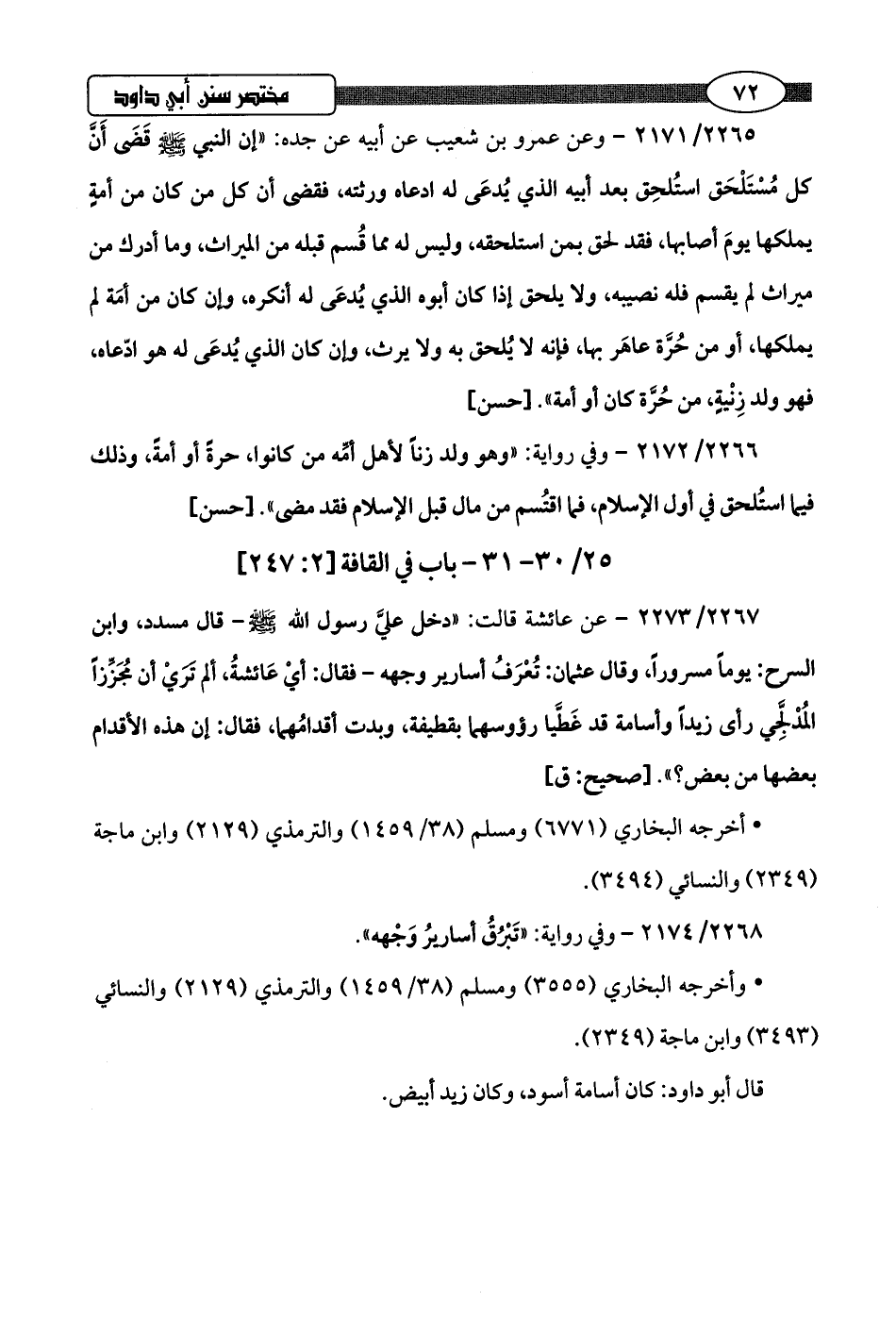 2267/ 2273 - عن عائشة قالت: "دخل عليَّ رسول اللَّه -صلى اللَّه عليه وسلم- قال مسدد، وابن السرح: يومًا مسرورًا، وقال عثمان: تُعْرَفُ أسارير وجهه -فقال: أيْ عَائشةُ، ألم ترَيْ أن مُجَزِّزًا المُدْلَّجي رأى زيدًا وأسامة قد غَطَّيا رؤوسهما بقطيفة، وبدت أقدامُهما، فقال: إن هذه الأقدام بعضها من بعض؟ ".hصحيح: ق]